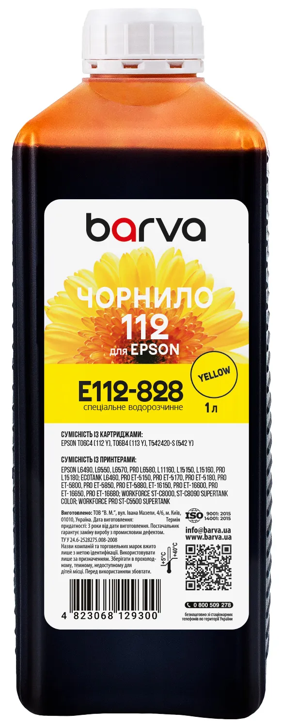 Чорнило для Epson 112 Y спеціальне 1 л, водорозчинне, жовте Barva (E112-828) опис: