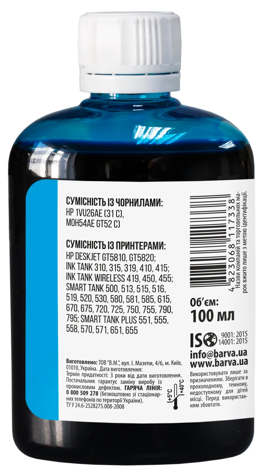 Чорнило для HP GT52 C спеціальне 100 мл, водорозчинне, блакитне Barva (HGT52-736) опис: