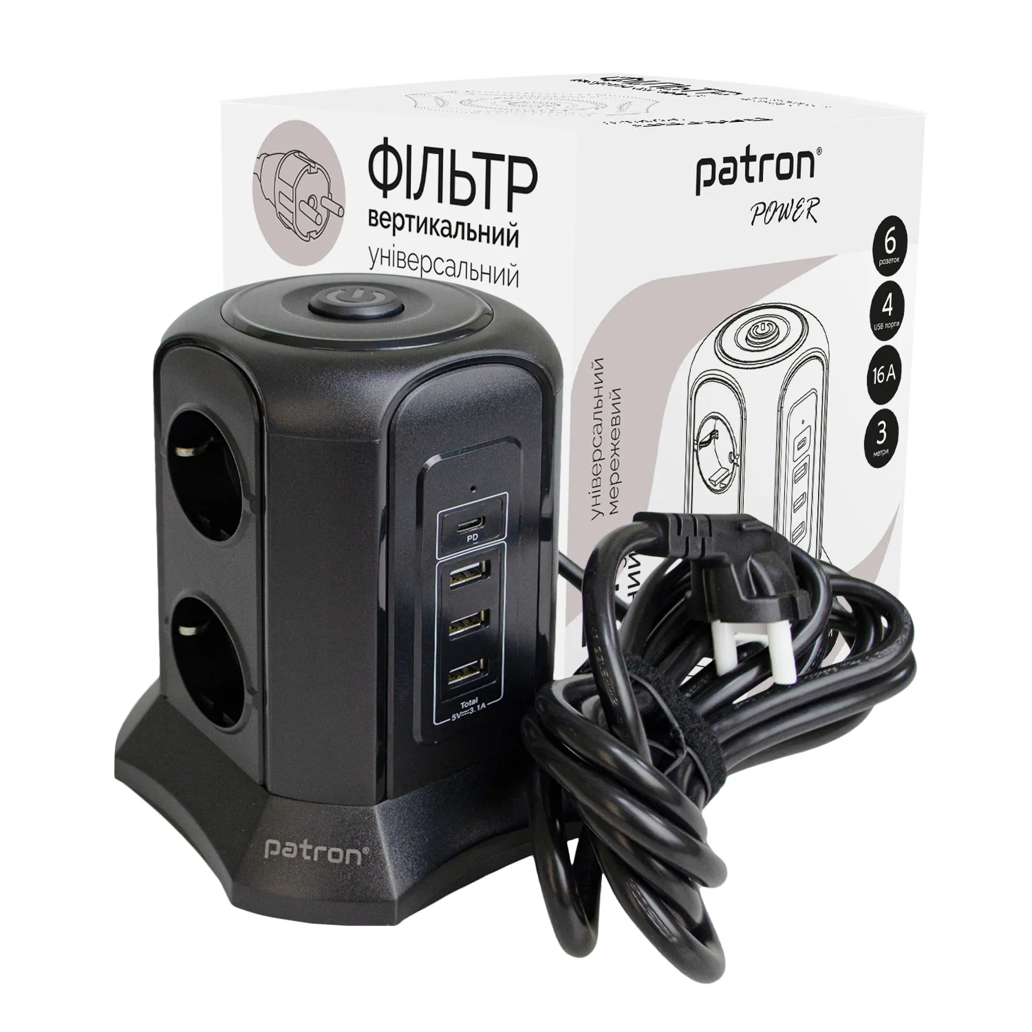 ФІльтр мережевий 6 розеток + 3 х USB, 1 х USB-C, вежа, 3 м, 16 А, 250 В, чорний Patron Power (SP-1663-USBT)