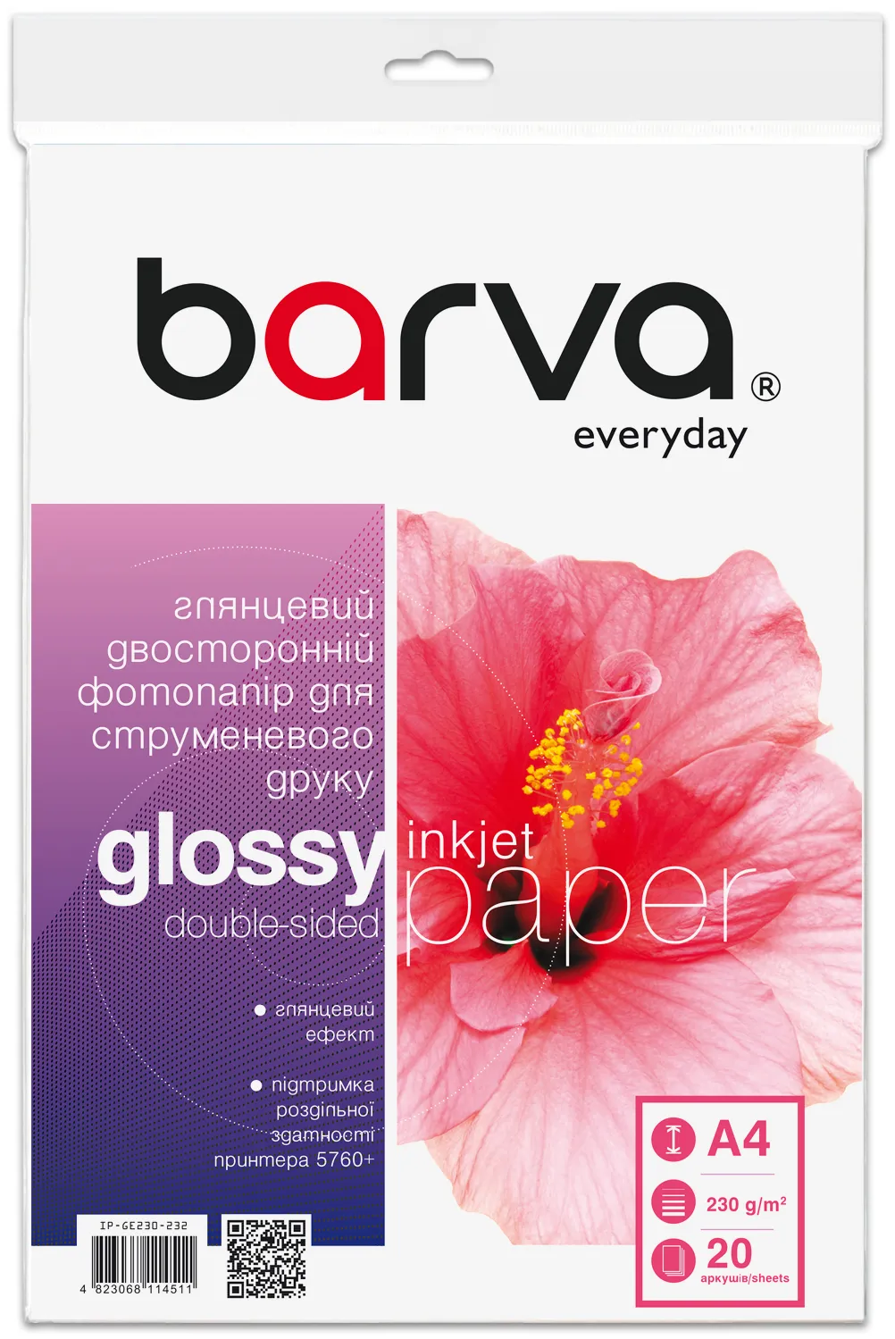Фотопапір глянцевий двосторонній 230 г/м2, A4, 20 арк Everyday Barva (IP-GE230-232) опис