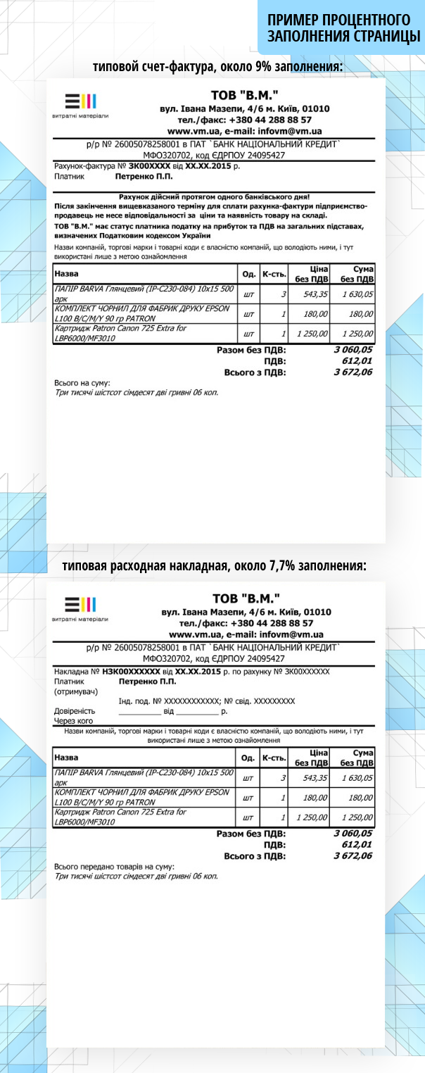 Часто на сайтах или в магазинах Вы можете видеть, что в характеристиках картриджа указан ресурс печати, который измеряется в количестве страниц (наиболее распространенные 1400стр., 1600стр., 1800стр., 2100стр., 2200стр.) Производители в характеристиках картриджа приводят его расчетный ресурс, в так называемых страницах  с 5% заполнением. Что это такое? Это – слегка устаревший стандарт, основанный на листе, заполненном текстом, отпечатанным на пишущей машинке, через 2 интервала. Если же посмотреть на  наши реалии, то типовой счет-фактура занимает около 9% а расходная накладная около 7,7%: