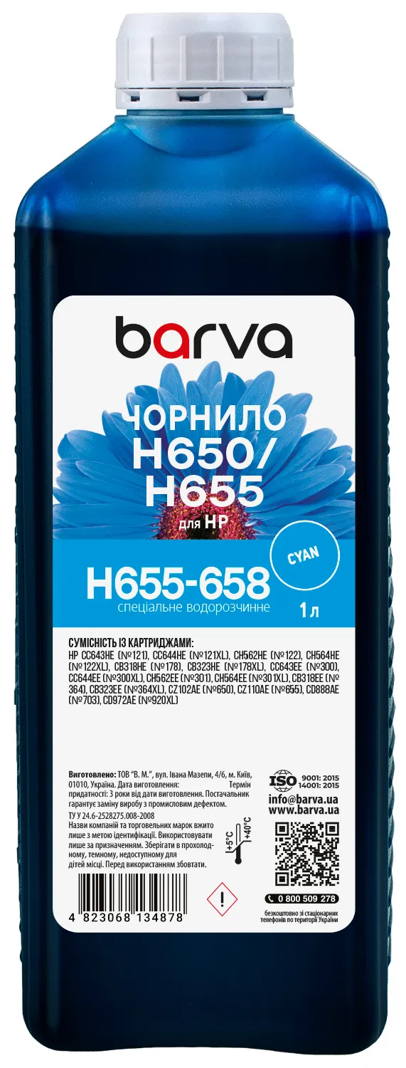 Чернила для HP 122/178/650/655 специальные 1 л, водорастворимые, голубые Barva (H655-658) - заказывайте на сайте patronservice.ua