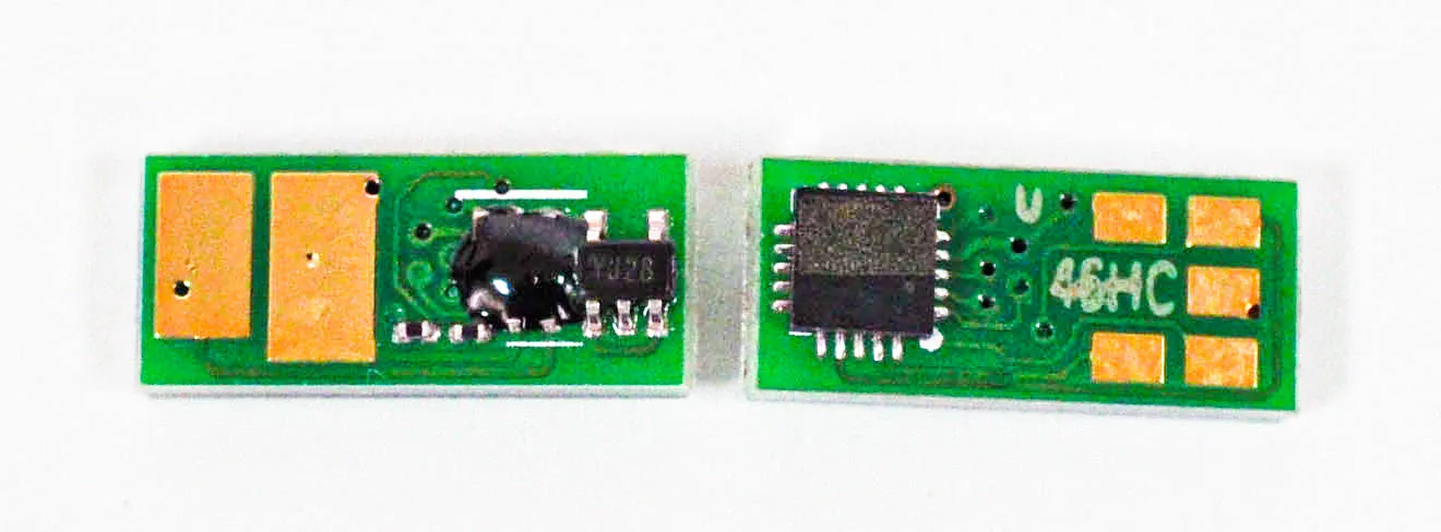Что такое чип для картриджа? Это небольшая по размеру микросхема, в которую вшита информация о ресурсе самого картриджа, обеспечен функцией обмена данными с принтером. Проще говоря, благодаря чипу аппарат может посчитать количество отпечатанных страниц. В момент, когда счётчик страниц подошел к концу, вы увидите предупреждение о том, что картридж закончился и его необходимо заменить, даже если в бункере картриджа остался неиспользованный тонер.