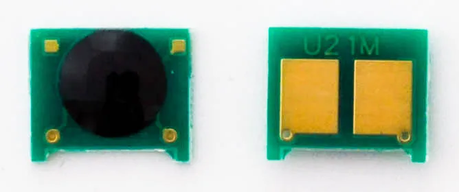 Что такое чип для картриджа? Это небольшая по размеру микросхема, в которую вшита информация о ресурсе самого картриджа, обеспечен функцией обмена данными с принтером. Проще говоря, благодаря чипу аппарат может посчитать количество отпечатанных страниц. В момент, когда счётчик страниц подошел к концу, вы увидите предупреждение о том, что картридж закончился и его необходимо заменить, даже если в бункере картриджа остался неиспользованный тонер.