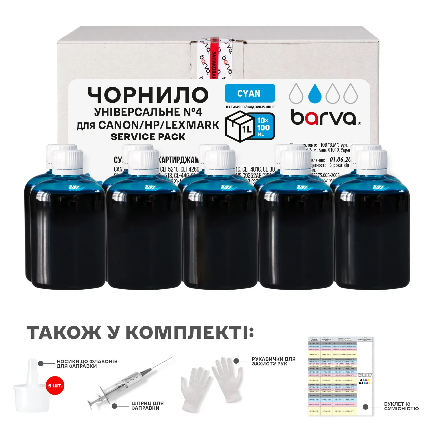 Чернила для Canon/HP/Lexmark универсальные №4 10x100 мл, водорастворимые, голубые Service Pack Barva (CU4-1SP-C) описание: