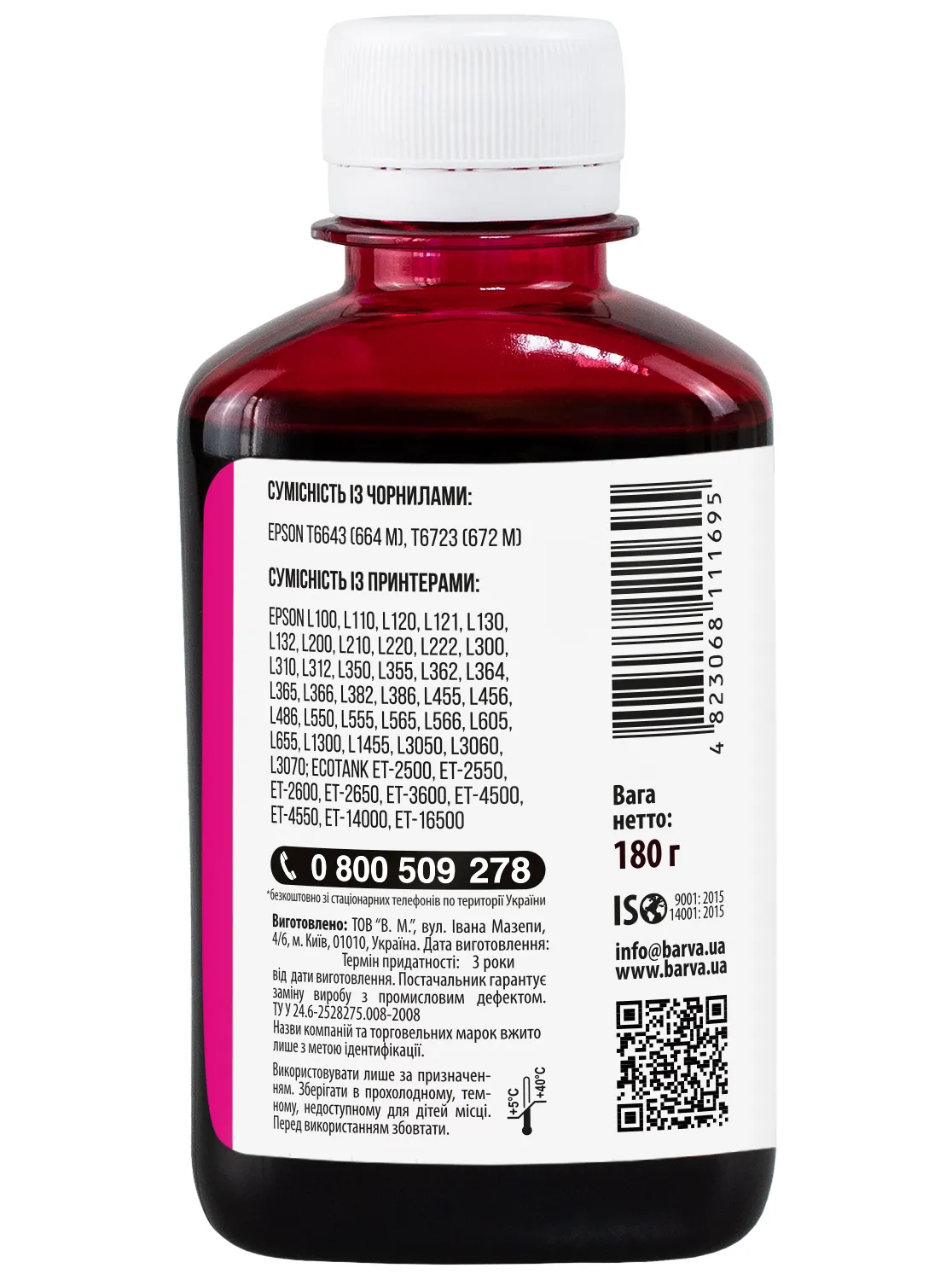 Украинская компания ООО «В.М.» занимается производством чернил под торговой маркой Barva уже много лет. На базе собственной лаборатории осуществляется как разработка новых формул, так и непрерывный контроль качества выпускаемой продукции. При производстве чернил производитель следует стандартам ISO 9001:2015 и ISO 14001:2015.