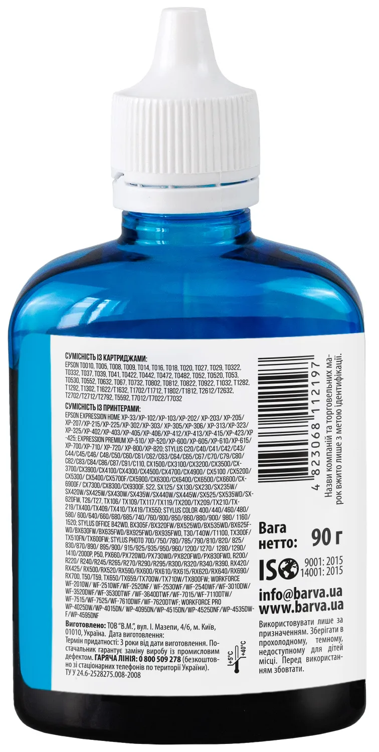 Украинская компания ООО «В.М.» занимается производством чернил под торговой маркой Barva уже много лет. На базе собственной лаборатории осуществляется как разработка новых формул, так и непрерывный контроль качества выпускаемой продукции. При производстве чернил производитель следует стандартам ISO 9001:2015 и ISO 14001:2015.