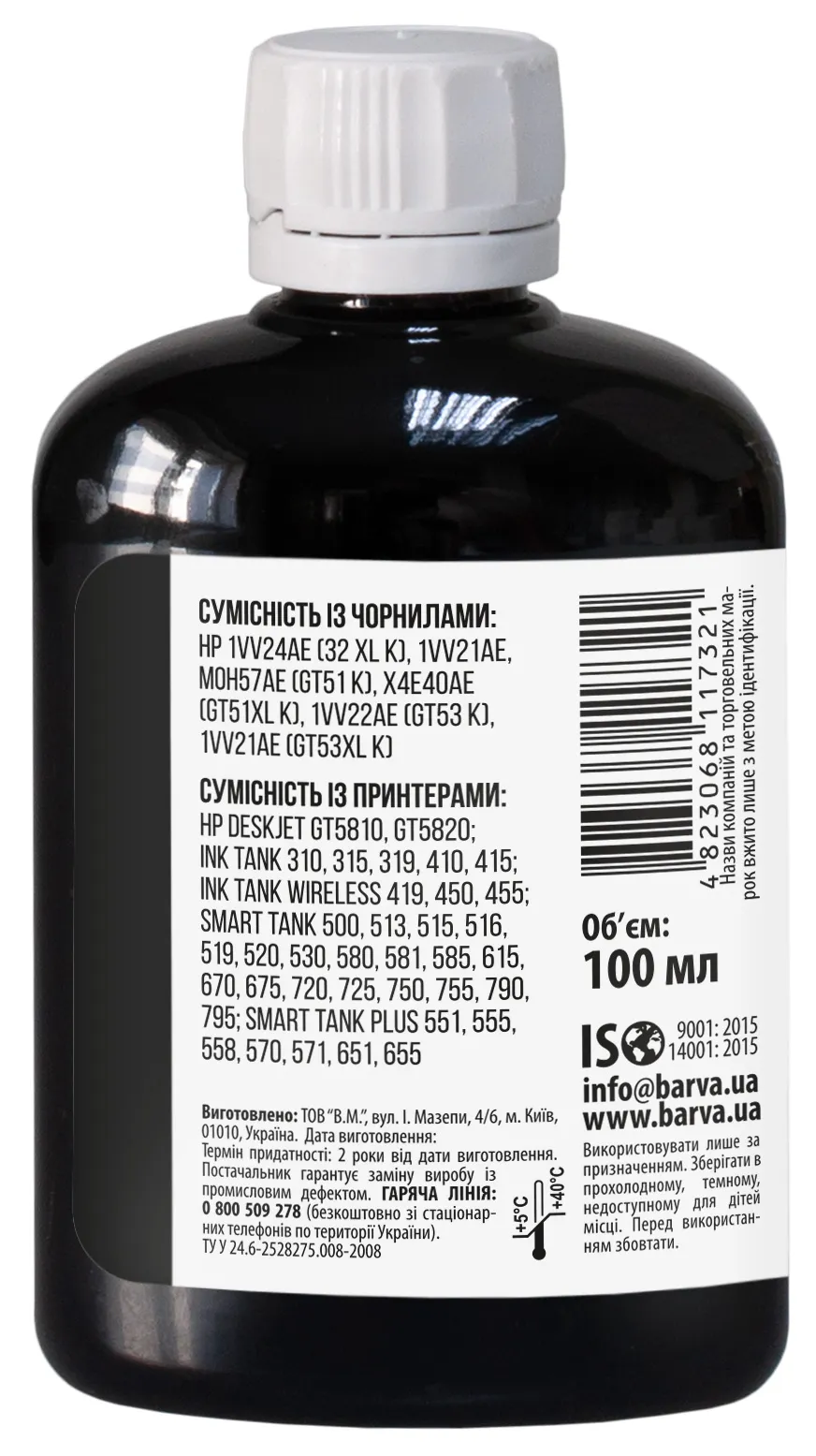 Украинская компания ООО «В.М.» занимается производством чернил под торговой маркой Barva уже много лет. На базе собственной лаборатории осуществляется как разработка новых формул, так и непрерывный контроль качества выпускаемой продукции. При производстве чернил производитель следует стандартам ISO 9001:2015 и ISO 14001:2015.