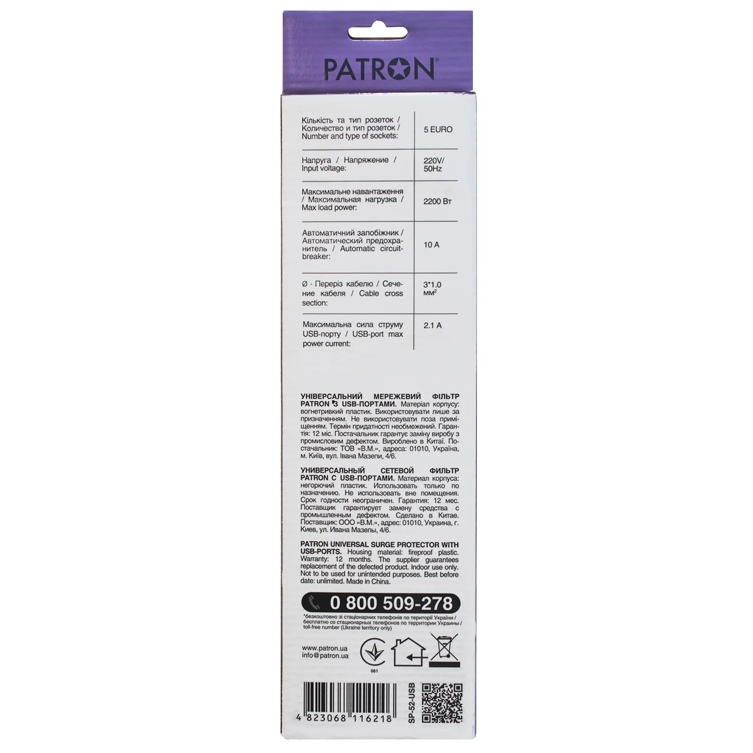 Корпус фильтра Patron выполнен из прочного негорючего пластика и имеет отверстия для крепления на стену. Кабель сетевого фильтра имеет сечение 3*1.0 мм, что позволяет стабильно работать при высоких нагрузках и не перегреваться.