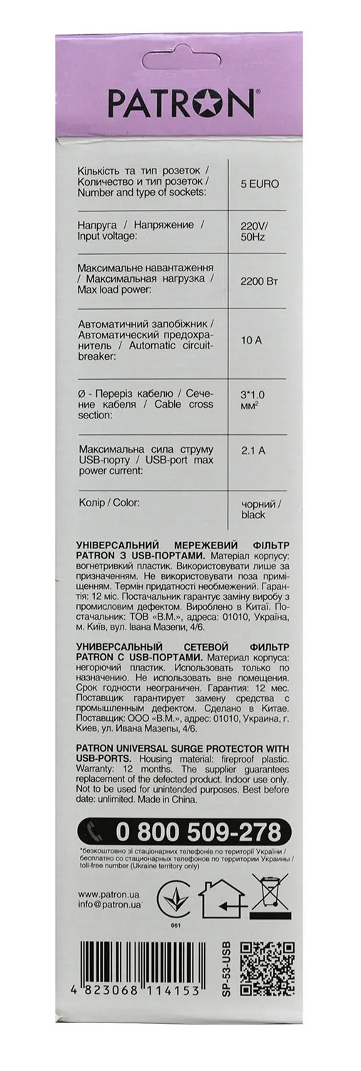 Корпус фильтра Patron выполнен из прочного негорючего пластика и имеет отверстия для крепления на стену. Кабель сетевого фильтра имеет сечение 3*1.0 мм, что позволяет стабильно работать при высоких нагрузках и не перегреваться.