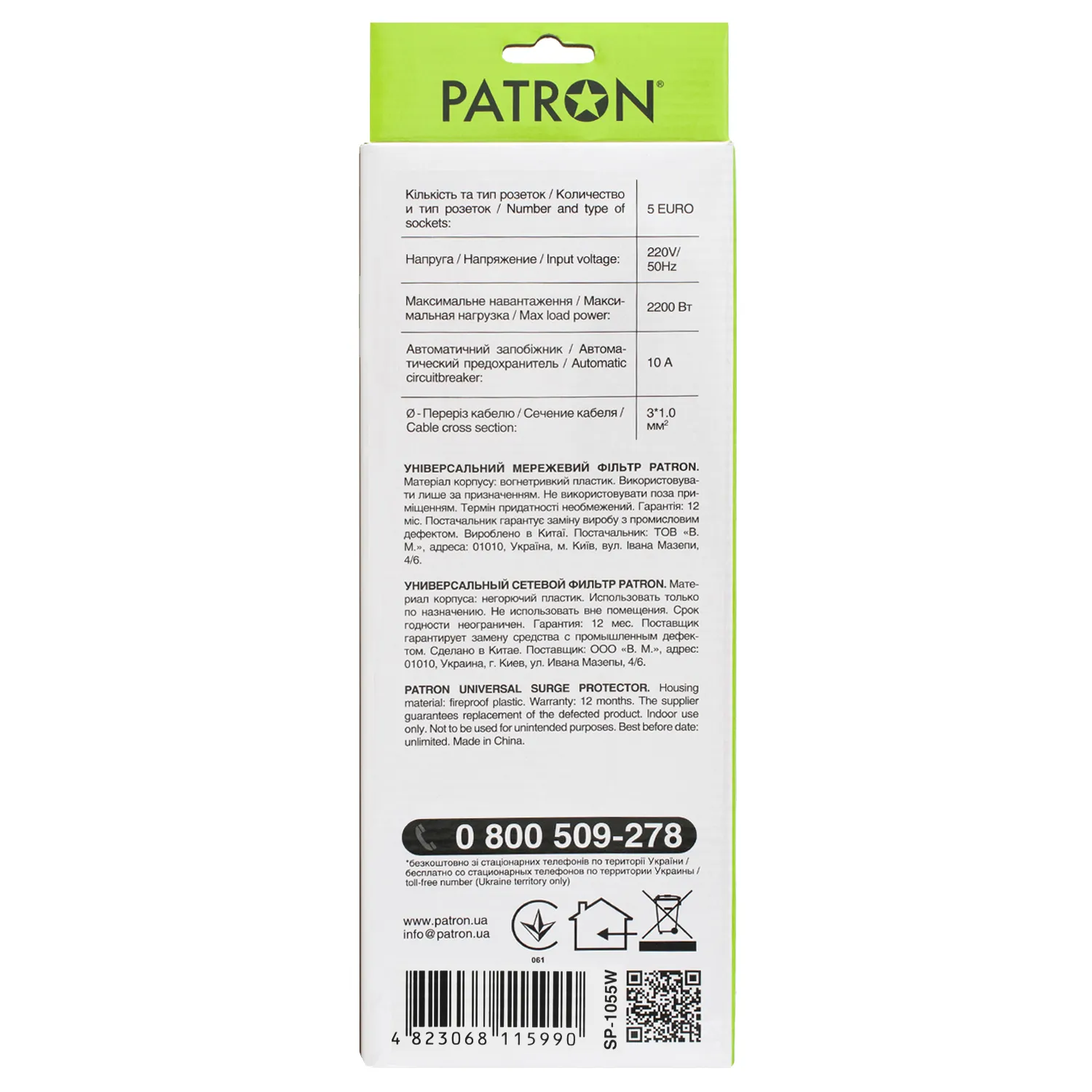 - Фильтр сетевой 5 розеток, 5 м, белый, 3*1мм2 Patron (SP-1055W)