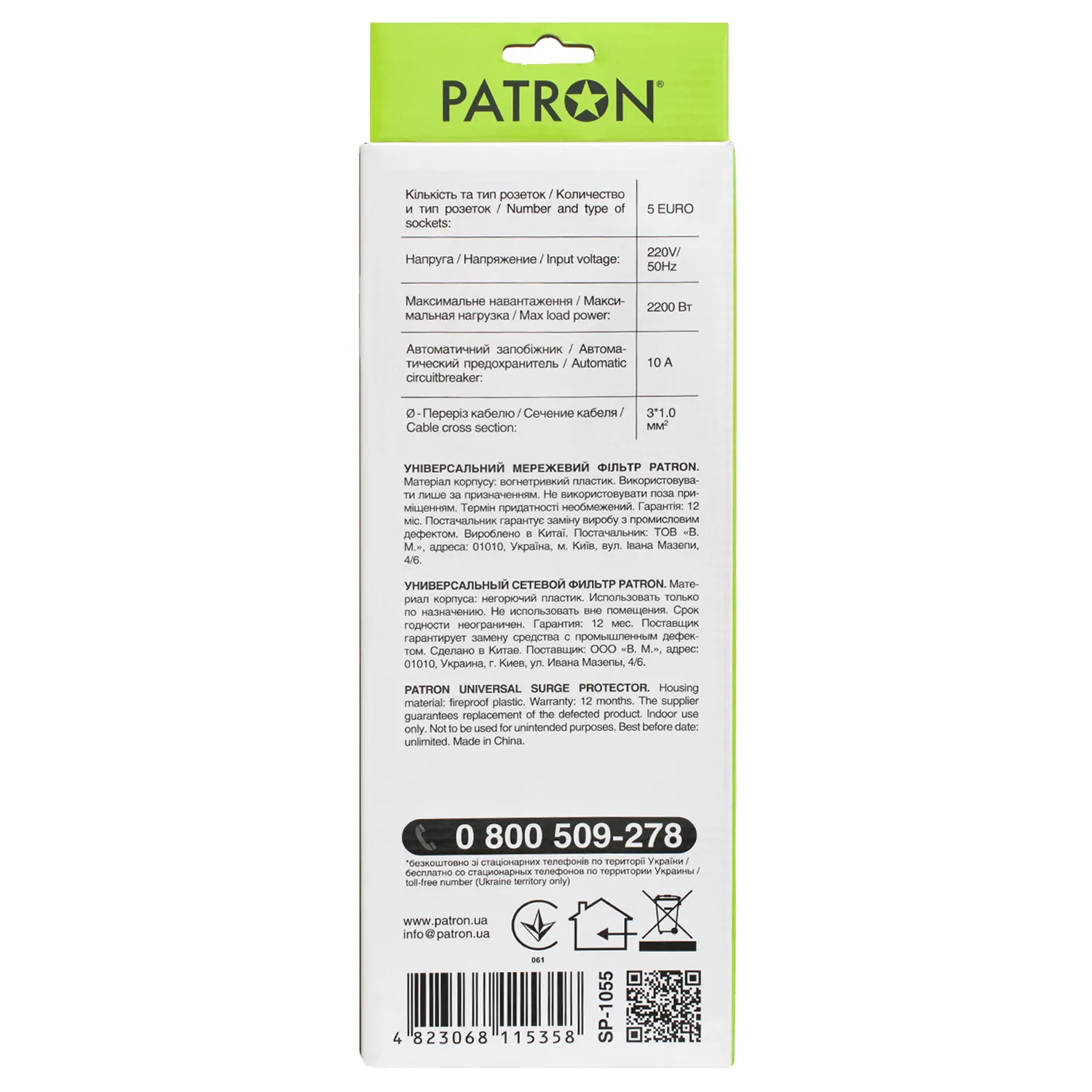 Корпус фильтра Patron выполнен из прочного негорючего пластика и имеет отверстия для крепления на стену. Кабель сетевого фильтра имеет сечение 3*1.0 мм, что позволяет стабильно работать при высоких нагрузках и не перегреваться.