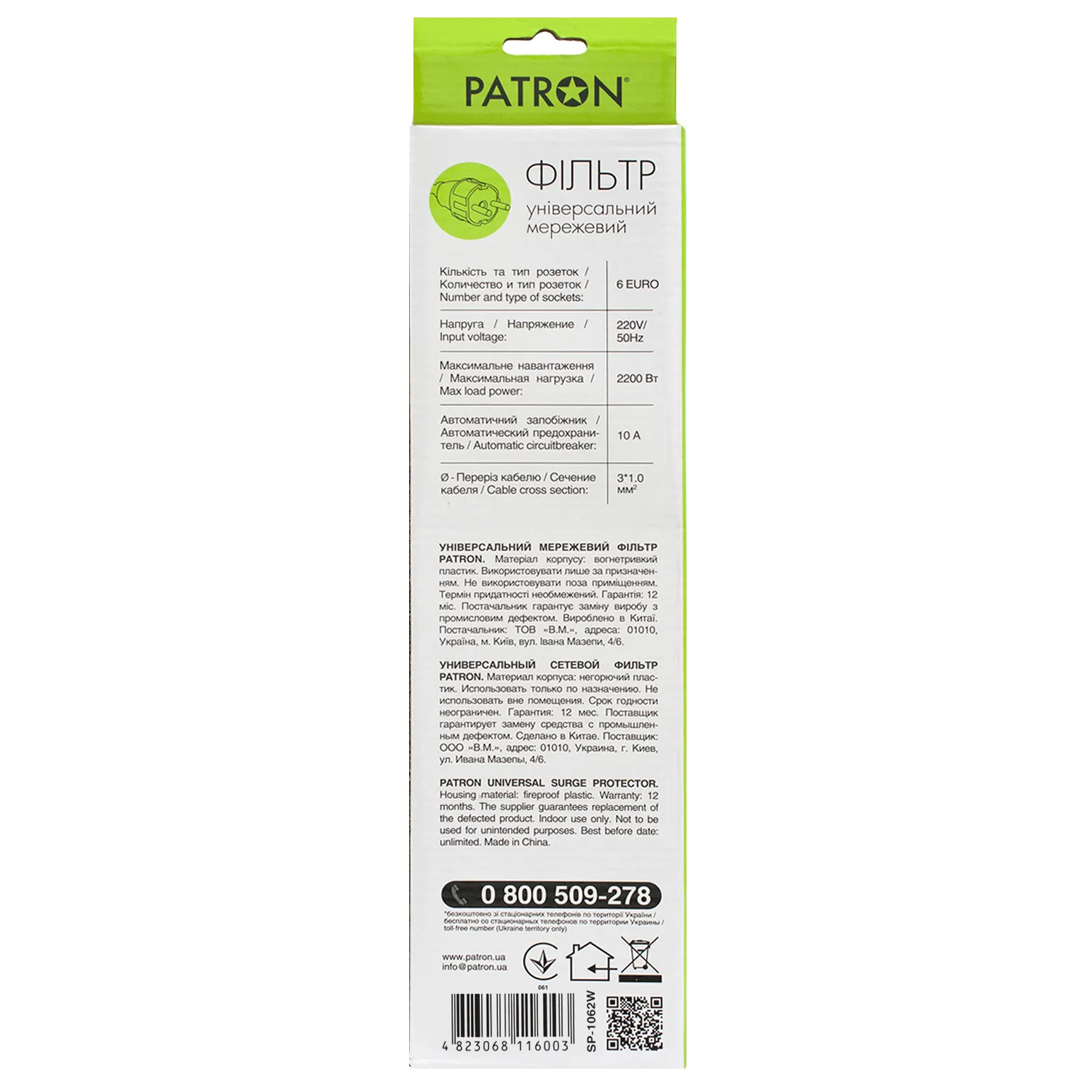 Корпус фильтра Patron выполнен из прочного негорючего пластика и имеет отверстия для крепления на стену. Кабель сетевого фильтра имеет сечение 3*1.0 мм, что позволяет стабильно работать при высоких нагрузках и не перегреваться.
