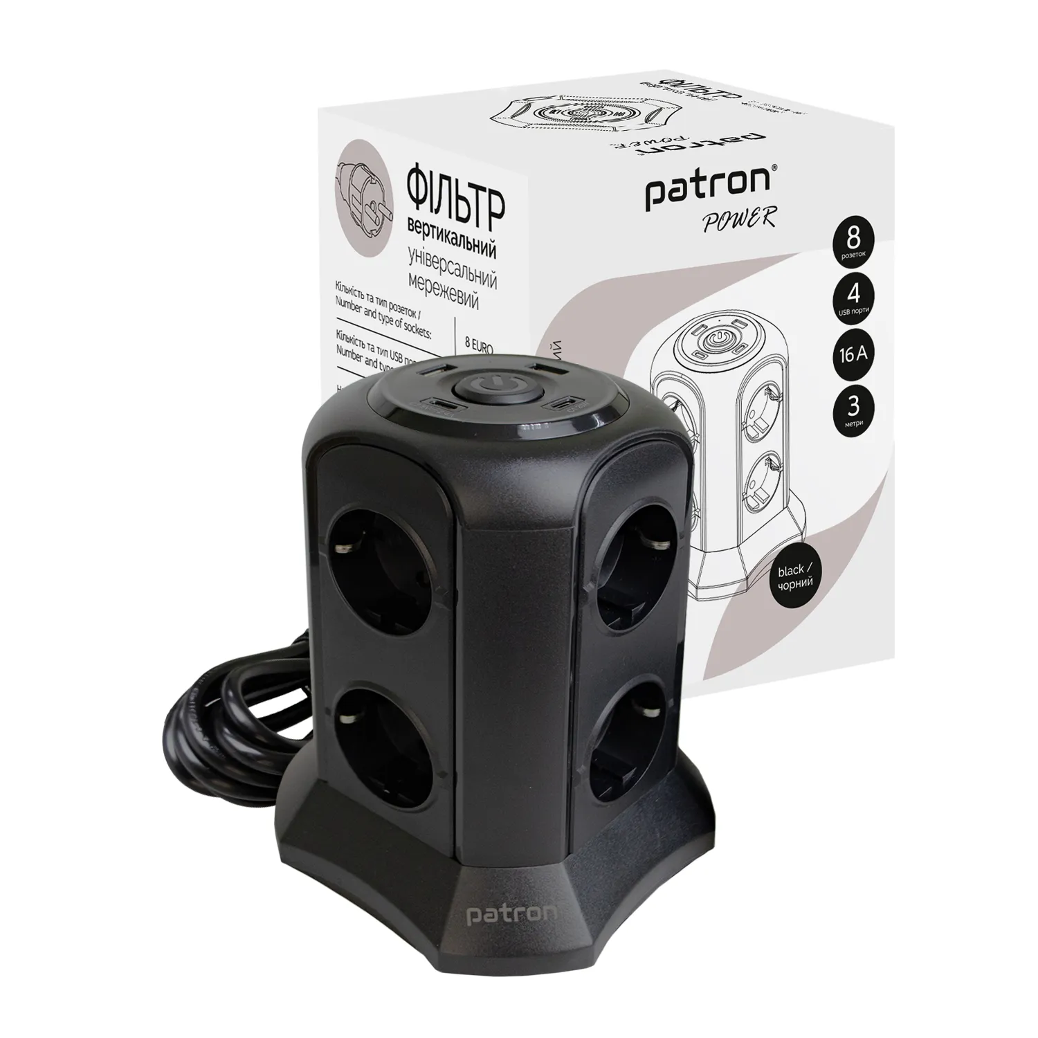 - Фильтр сетевой 8 розеток + 2 х USB, 2 x USB-C, башня, 3 м, 16 А, 250 В, черный Patron Power (SP-1683-USBT)