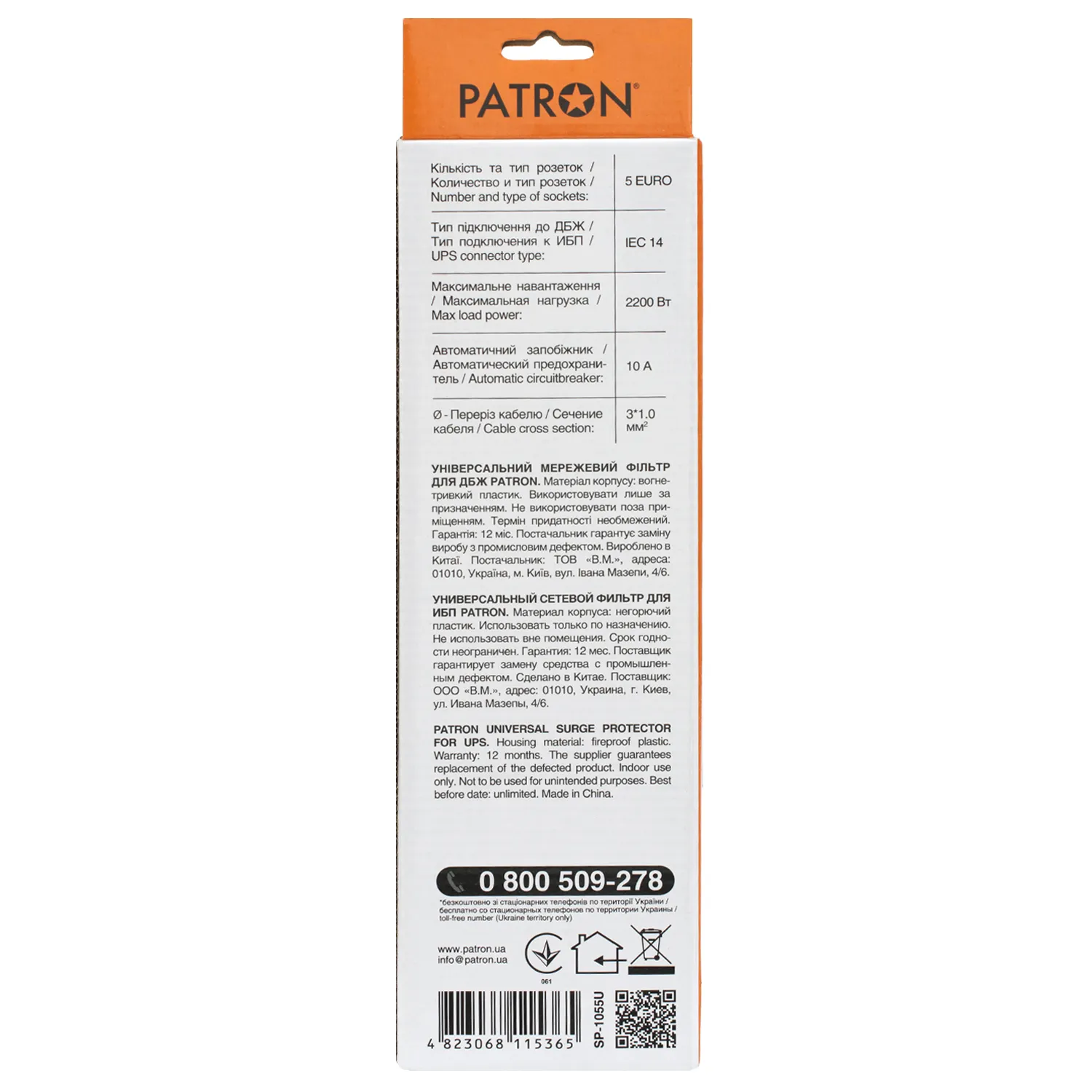- Фильтр сетевой для ИБП 5 розеток, 2 м, черный, 3*1мм2 Patron (SP-1055U)