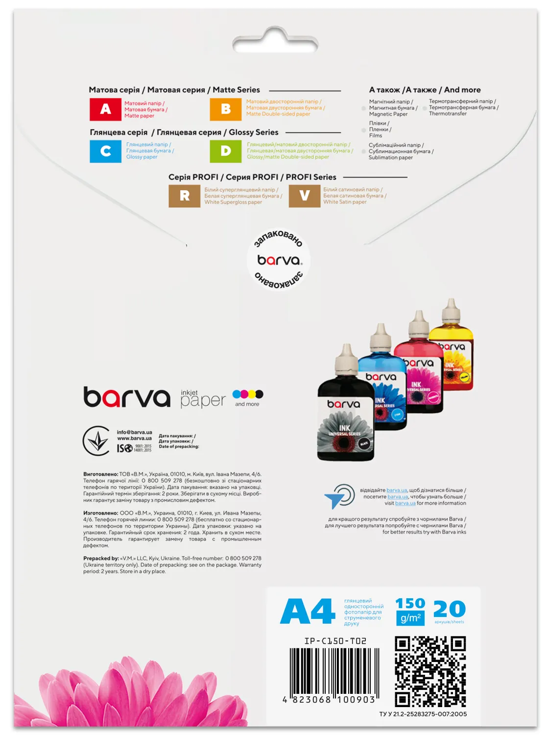 Под торговой маркой Barva на рынок выходит широкий ассортимент материалов для струйной печати, который поможет Вам с выполнением различных задач – от печати фотографий, до изготовления рекламных и маркетинговых материалов. Носители для струйной печати под данной торговой маркой выпускаются на рынок украинской компанией ТОВ «В. М.» с 2003 года и уже успели завоевать доверие пользователей неизменно высоким качеством и доступными ценами.