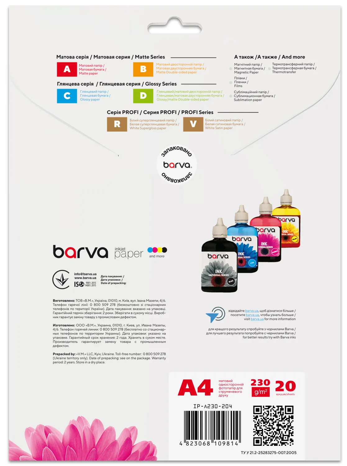 Под торговой маркой Barva на рынок выходит широкий ассортимент материалов для струйной печати, который поможет Вам с выполнением различных задач – от печати фотографий, до изготовления рекламных и маркетинговых материалов. Носители для струйной печати под данной торговой маркой выпускаются на рынок украинской компанией ТОВ «В. М.» с 2003 года и уже успели завоевать доверие пользователей неизменно высоким качеством и доступными ценами.