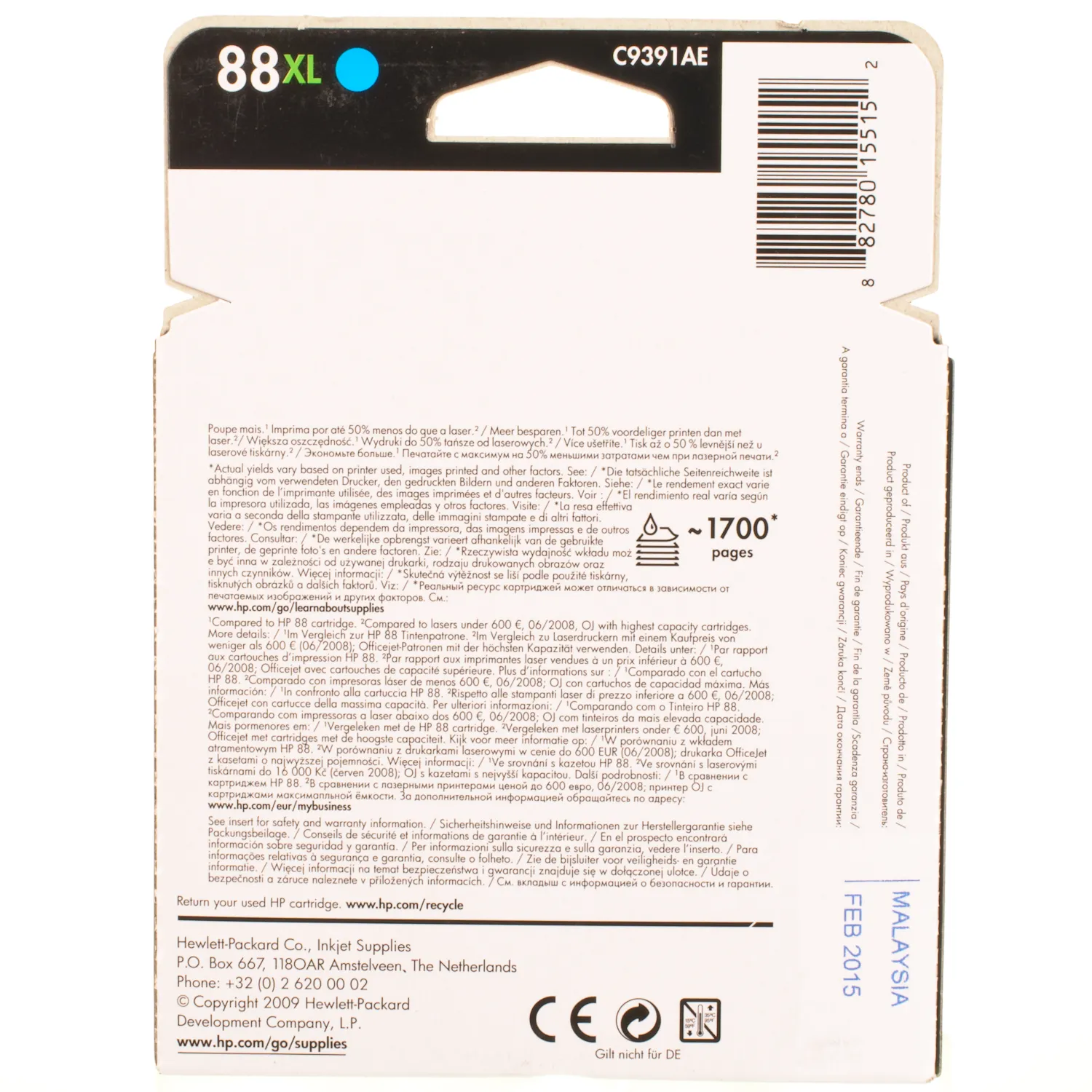 Струйный картридж C9391AE HP имеет ресурс – 1700 страниц.
