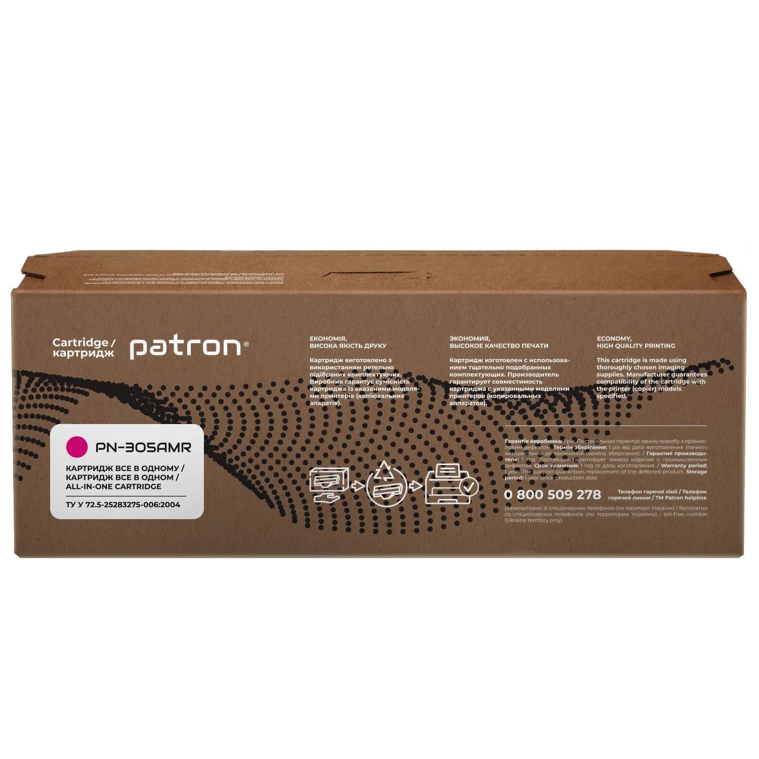 Мы гарантируем 12 месяцев исправной работы картриджа. Если у Вас есть опасения, что устройство печати может выйти из строя по причине картриджа Patron Extra – обратитесь в любой из авторизованных сервисных центров.