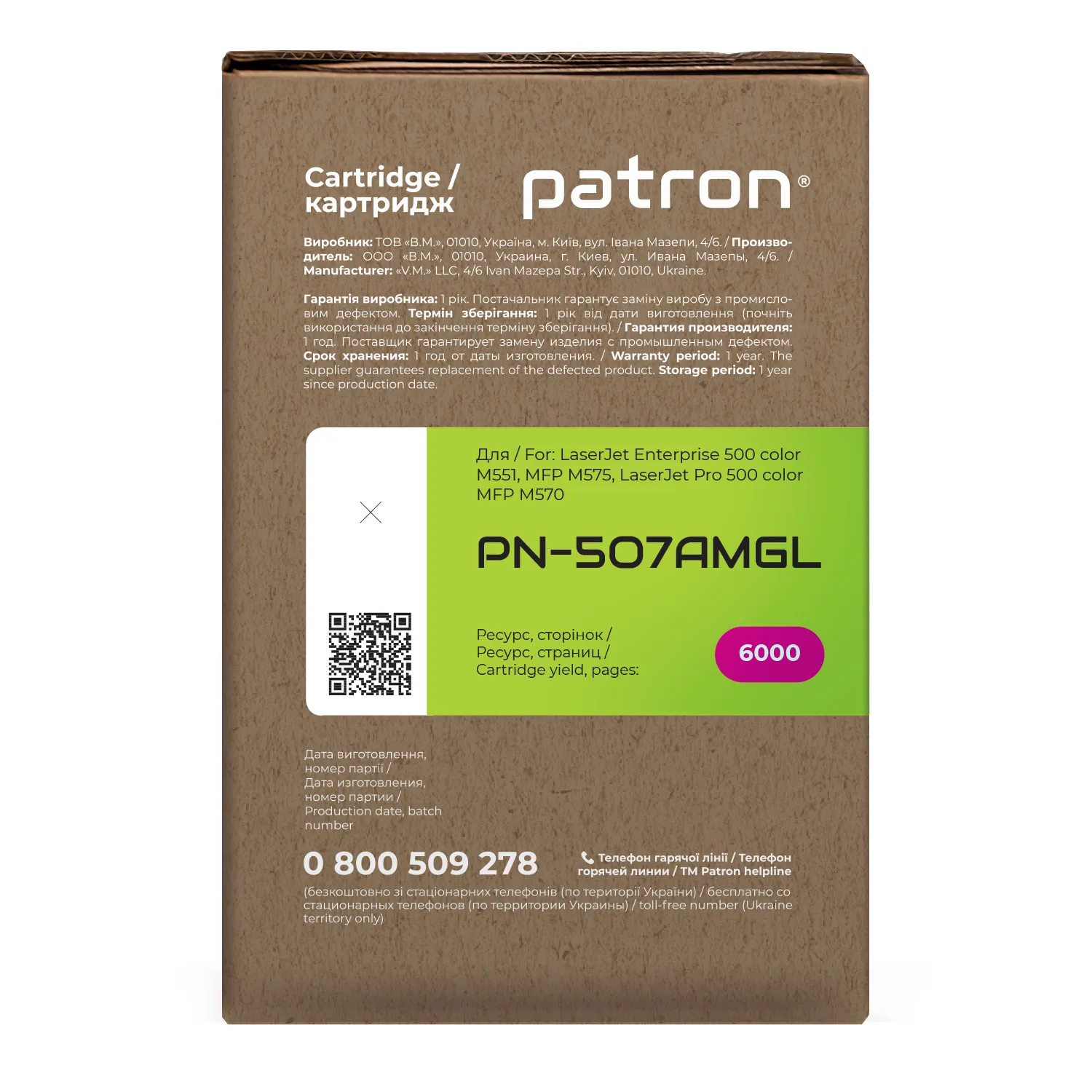 Мы позаботились о том, чтобы упаковка картриджа была не только экологичной, функциональной, имела минимально возможные физические размеры, но и содержала всю необходимую информацию. На зеленой этикетке находится информация о продукте, его совместимости с печатающими устройствами, номер партии, дата изготовления, контакты производителя, а также номер телефона бесплатной горячей линии для украинских потребителей.