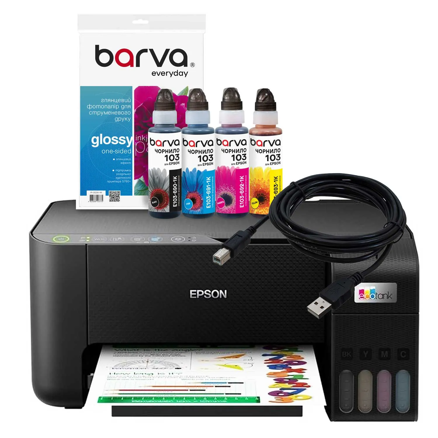 Комплект для печати Printer kit 4в1 МФУ EcoTank L3200 (C11CJ69401) + чернила Barva + бумага Barva + кабель A4 Epson