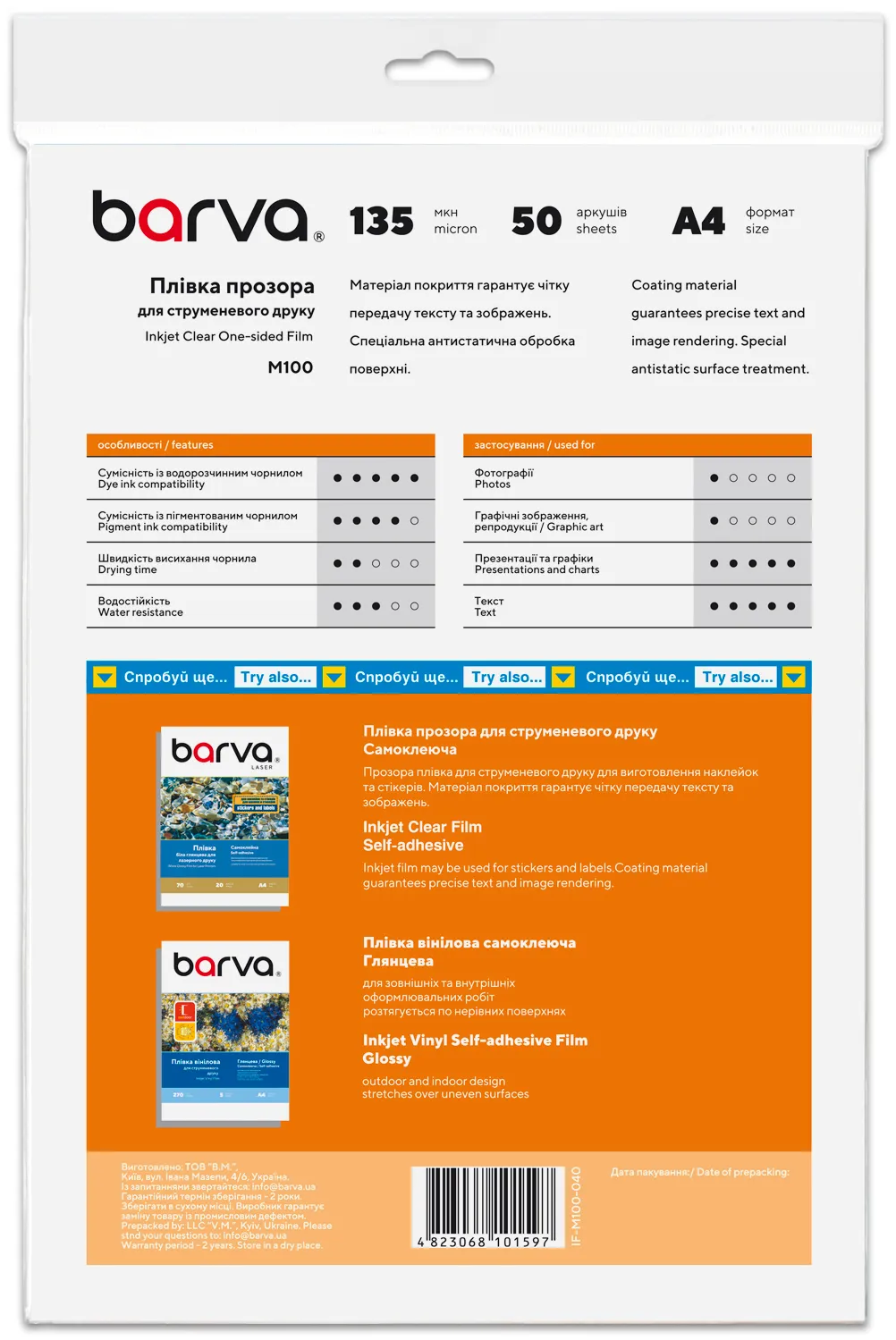 Пленка для струйной печати 135 мкм, А4, 50 л, полиэстеровая, прозрачная Barva (IF-M100-040) - прекрасный выбор для вас