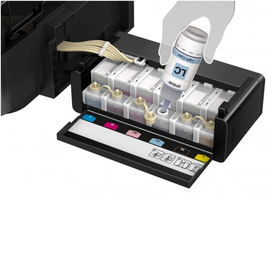 Принтер EPSON L810 (C11CE32402) — это уникальный фотопринтер со встроенными емкостями для чернил, вместо картриджей, специально созданный для тех, кому необходима экономичная печать фотографий без использования ПК. Самой удобной особенностью служит возможность печати фотографий без ПК, благодаря слоту для карт памяти, сенсорной панели управления и ЖК-экрану диагональю 6.9 см. EPSON L810 идеально подойдет, как профессиональным фотографам на мероприятиях, так и фотолюбителям, предпочитающим печатать фотографии высокого качества без ПК в домашних условиях. Кроме того вы можете редактировать фотографии прямо на экране вашего принтера (например сделать ее черно-белой или распечатать в режиме сепия). А возможность печати на CD/DVD дисках позволит вам создать уникальные коллекции музыкальных альбомов и фильмов с оригинальными обложками. Конструкция принтера предусматривает встроенные емкости для чернил. Оригинальные чернила Epson заправляются во встроенные емкости из контейнеров по 70 мл. Расходными материалами к служат контейнеры с чернилами высоким ресурсом. Так шести контейнеров с голубыми, пурпурными, желтыми, светло-голубыми, светло-пурпурными и черными чернилами хватит на печать 1800 цветных фотографий формата 10 х 15.