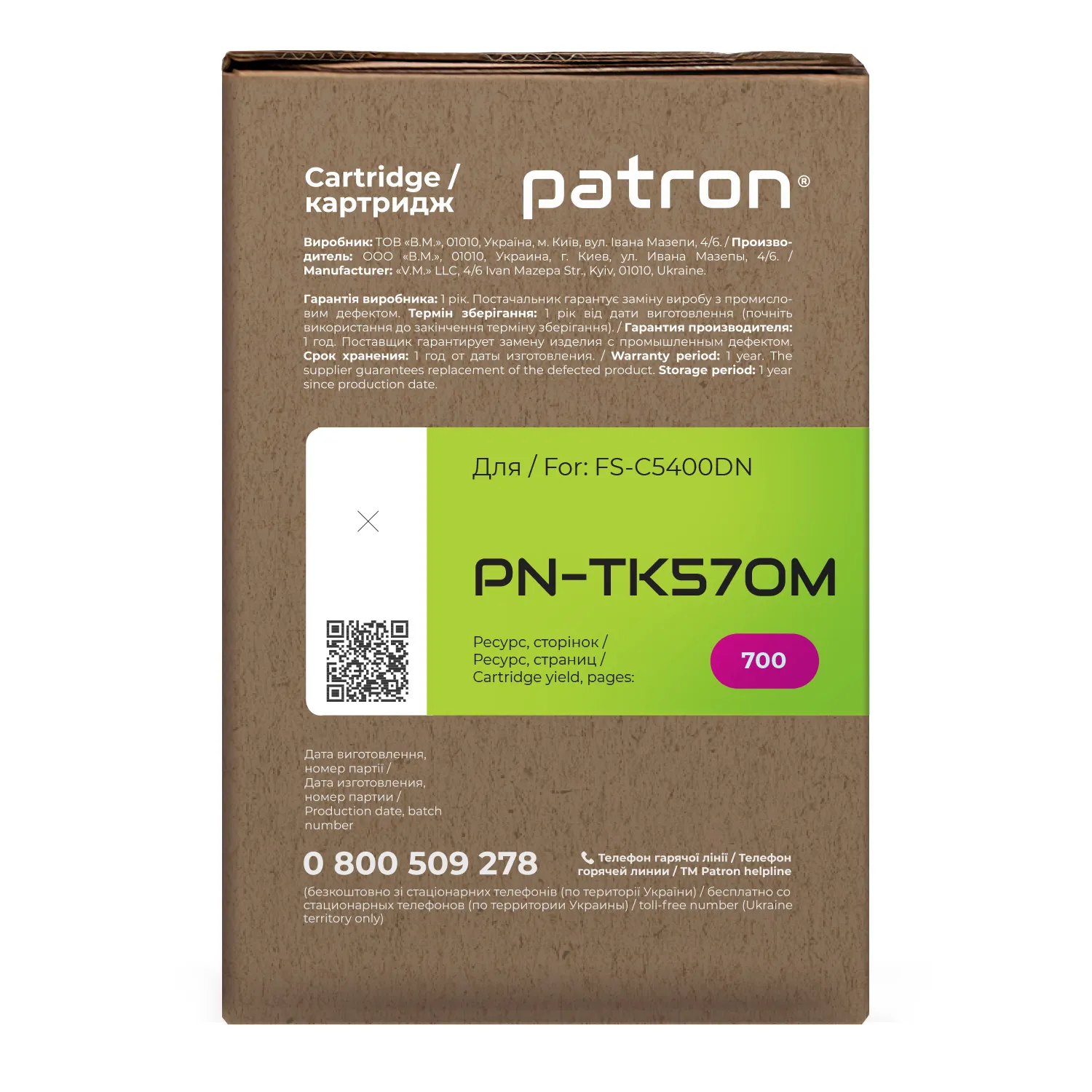 Мы позаботились о том, чтобы упаковка картриджа была не только экологичной, функциональной, имела минимально возможные физические размеры, но и содержала всю необходимую информацию. На зеленой этикетке находится информация о продукте, его совместимости с печатающими устройствами, номер партии, дата изготовления, контакты производителя, а также номер телефона бесплатной горячей линии для украинских потребителей.