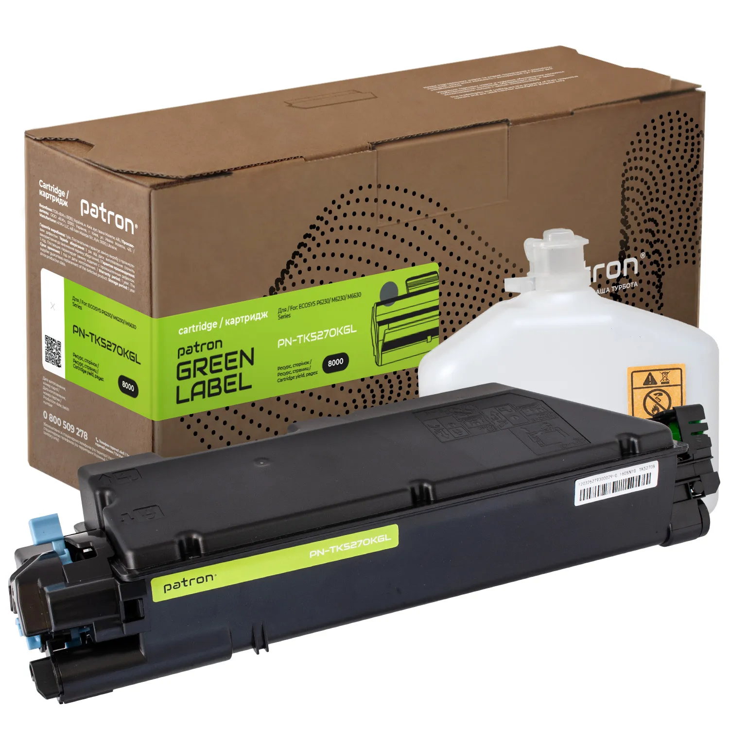 Виробництво картриджів Patron Green Label відбувається з виконанням вимог міжнародного стандарту по захисту навколишнього середовища - ISO 14001:2015. Залишки матеріалів і комплектуючих, що використовуються для виробництва картриджів Patron Green Label, передаються на утилізацію відповідно Закону України "Про відходи".