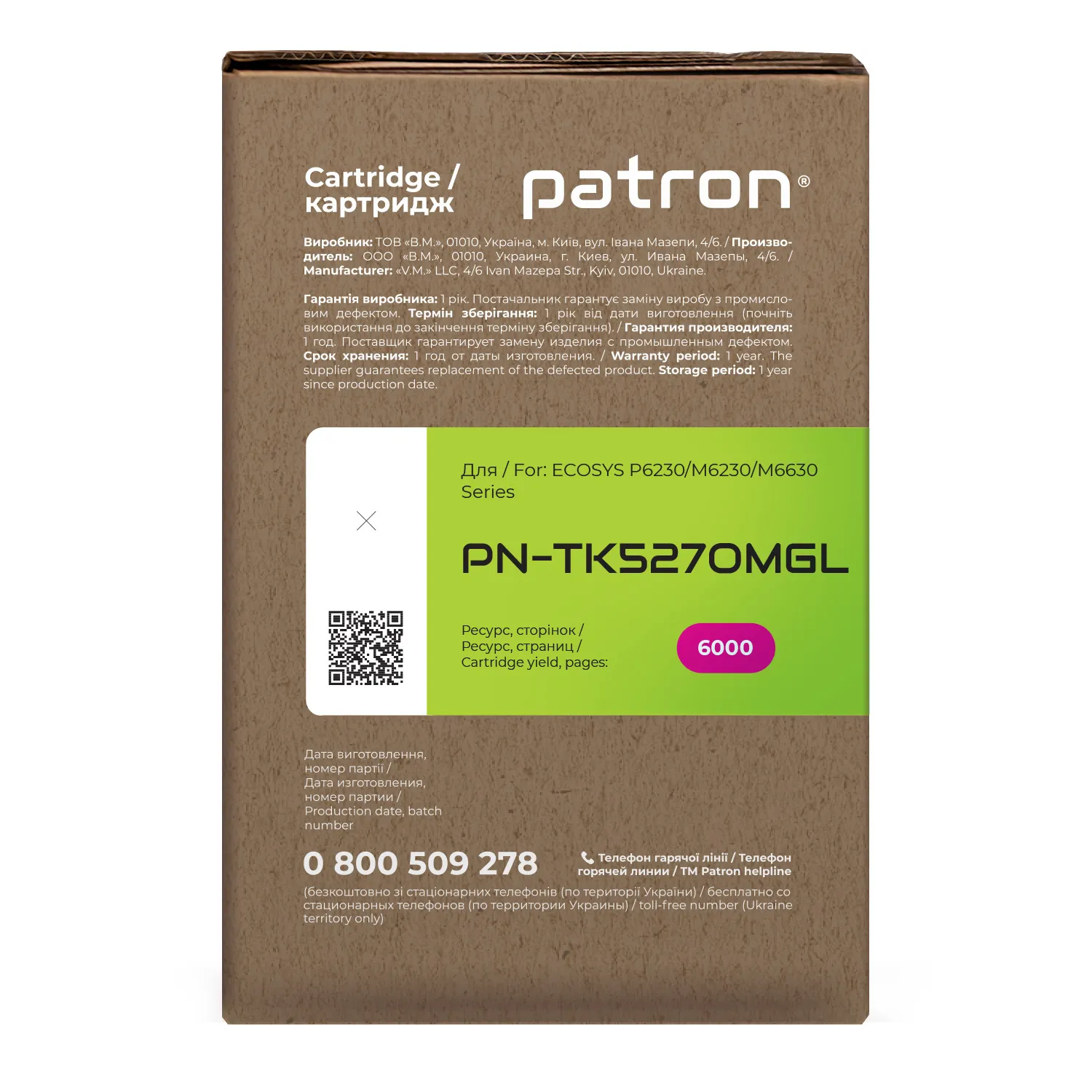 Ми потурбувалися про те, щоб упаковка картриджа була не лише екологічною, функціональною, мала мінімально можливі фізичні розміри, але і містила усю необхідну інформацію. На зеленій етикетці знаходиться інформація про картридж, його сумісність з друкувальними пристроями, номер партії, дата виготовлення, контакти виробника, а також номер телефону безкоштовної гарячої лінії для українських споживачів.