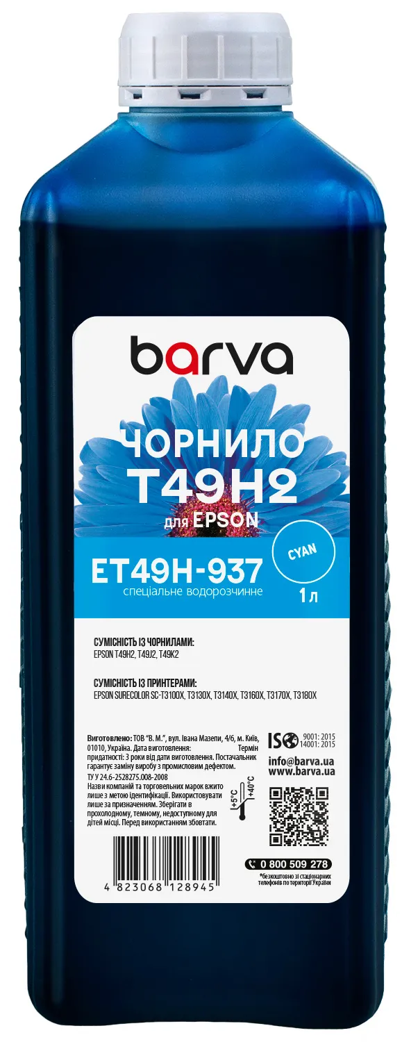 Чорнило для Epson T49H2 спеціальне 1 л, водорозчинне, блакитне Barva (ET49H-937) опис: