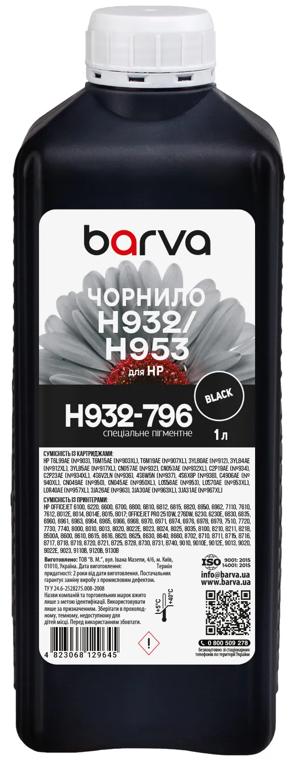Чорнило для HP 932/950/953 спеціальне 1 л, пігментне, чорне Barva (H932-796) опис: