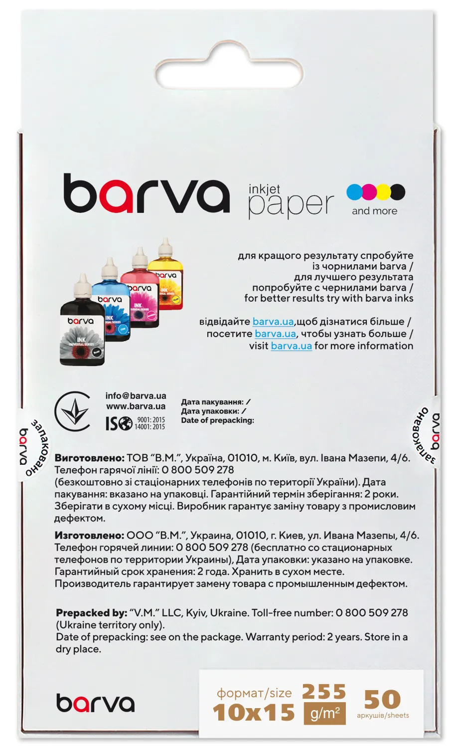 Під торговою маркою Barva на ринок виходить широкий асортимент матеріалів для струменевого друку, який допоможе Вам з виконанням різних завдань - від друку фотографій, до виготовлення рекламних і маркетингових матеріалів. Носії для струминного друку під цією торговою маркою випускаються на ринок українською компанією ТОВ «В. М. » з 2003 року і вже встигли завоювати довіру користувачів незмінно високою якістю та доступними цінами.