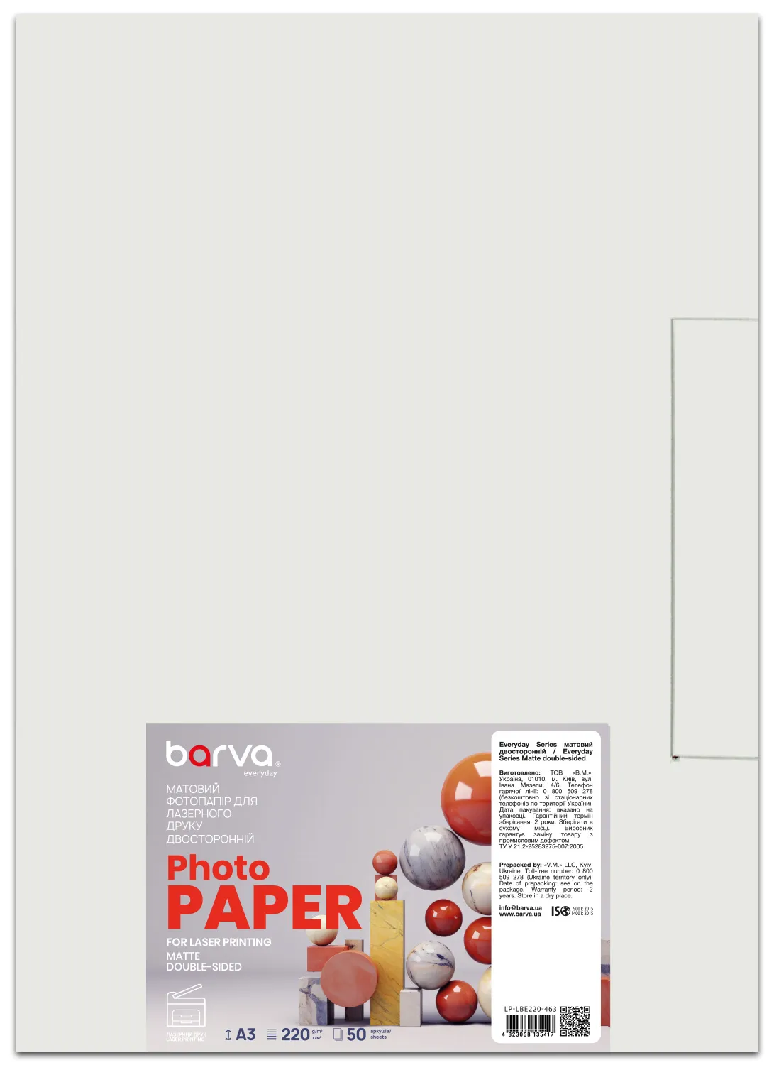 Фотопапір для лазерного друку матовий двосторонній 220 г/м2, A3, 50 арк Everyday Barva (LP-LBE220-463)