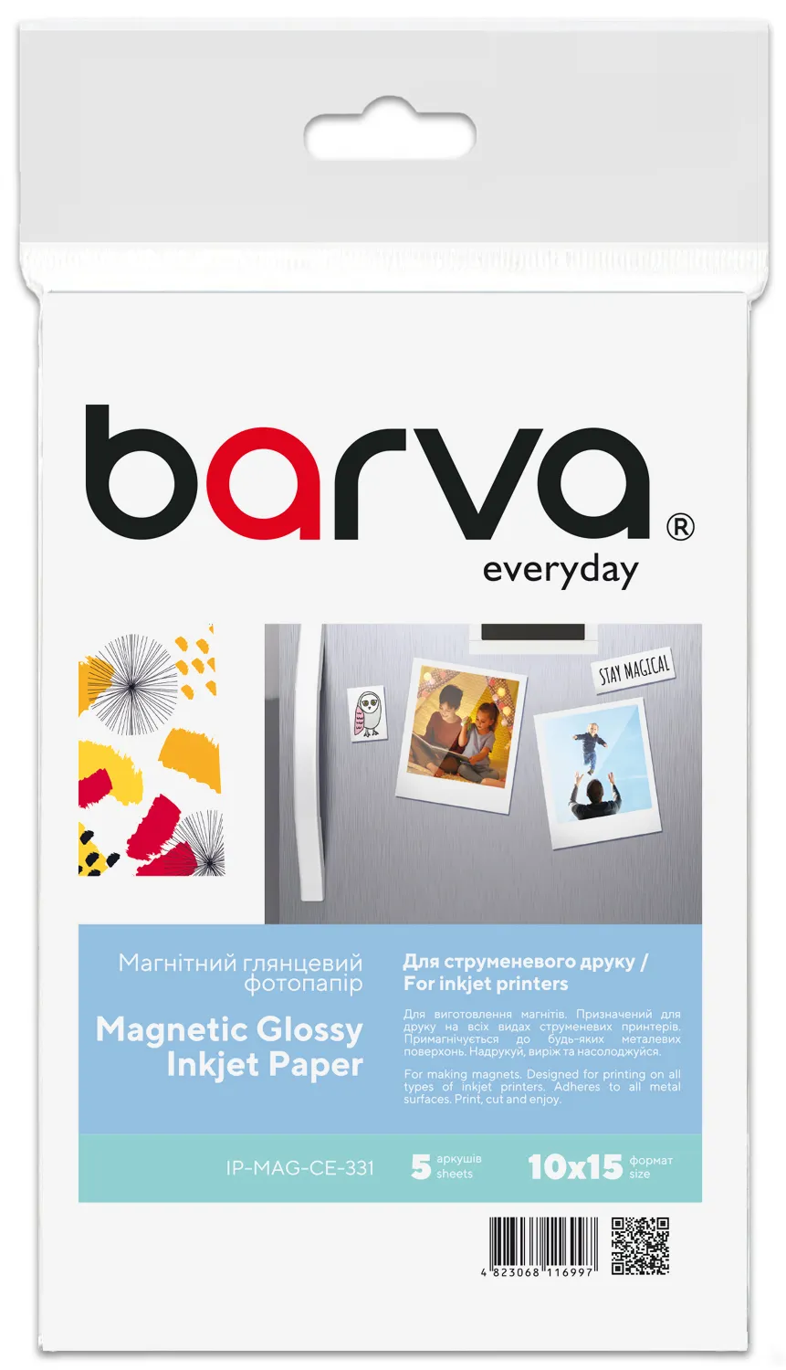 Глянцевий магнітний папір Barva серії Everyday – це сучасний матеріал для швидкого та недорогого виготовлення сувенірних магнітів, цінників, стікерів, реклами та іншої подібної продукції в домашніх умовах (для друку підійде звичайний струменевий принтер). Фотопапір магнітний глянцевий 660 г/м2 (0.31 мм), 10x15 см, 5 арк Everyday Barva (IP-MAG-CE-331) підходить для використання в струменевих пристроях.