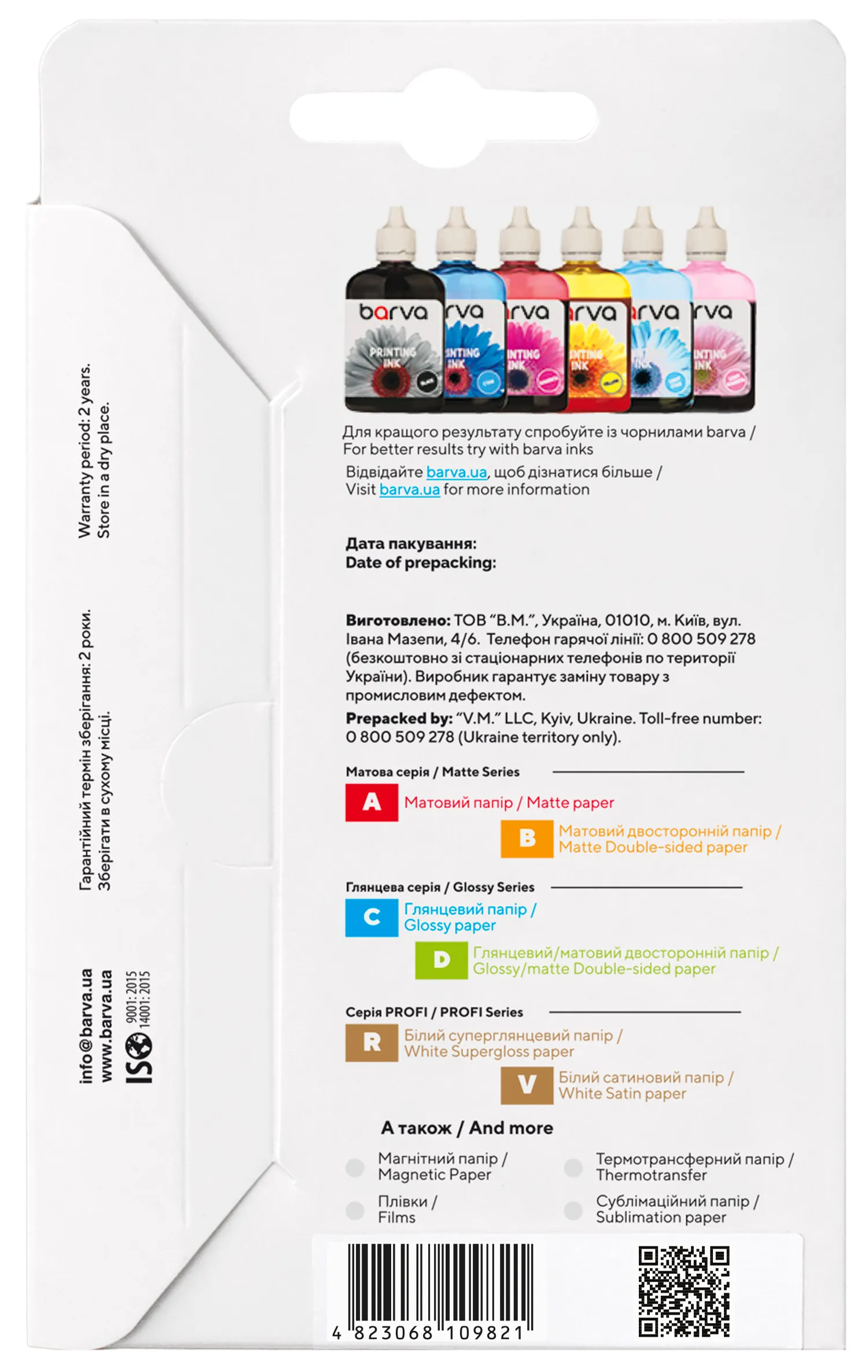 Під торговою маркою Barva на ринок виходить широкий асортимент матеріалів для струменевого друку, який допоможе Вам з виконанням різних завдань - від друку фотографій, до виготовлення рекламних і маркетингових матеріалів. Носії для струминного друку під цією торговою маркою випускаються на ринок українською компанією ТОВ «В. М. » з 2003 року і вже встигли завоювати довіру користувачів незмінно високою якістю та доступними цінами.