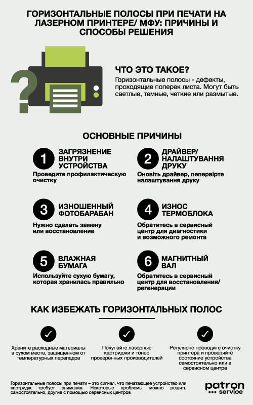 Горизонтальные полосы при печати – это сигнал, что печатающее устройство или картридж требует внимания. Некоторые проблемы можно решить самостоятельно, другие с помощью сервисных центров.
