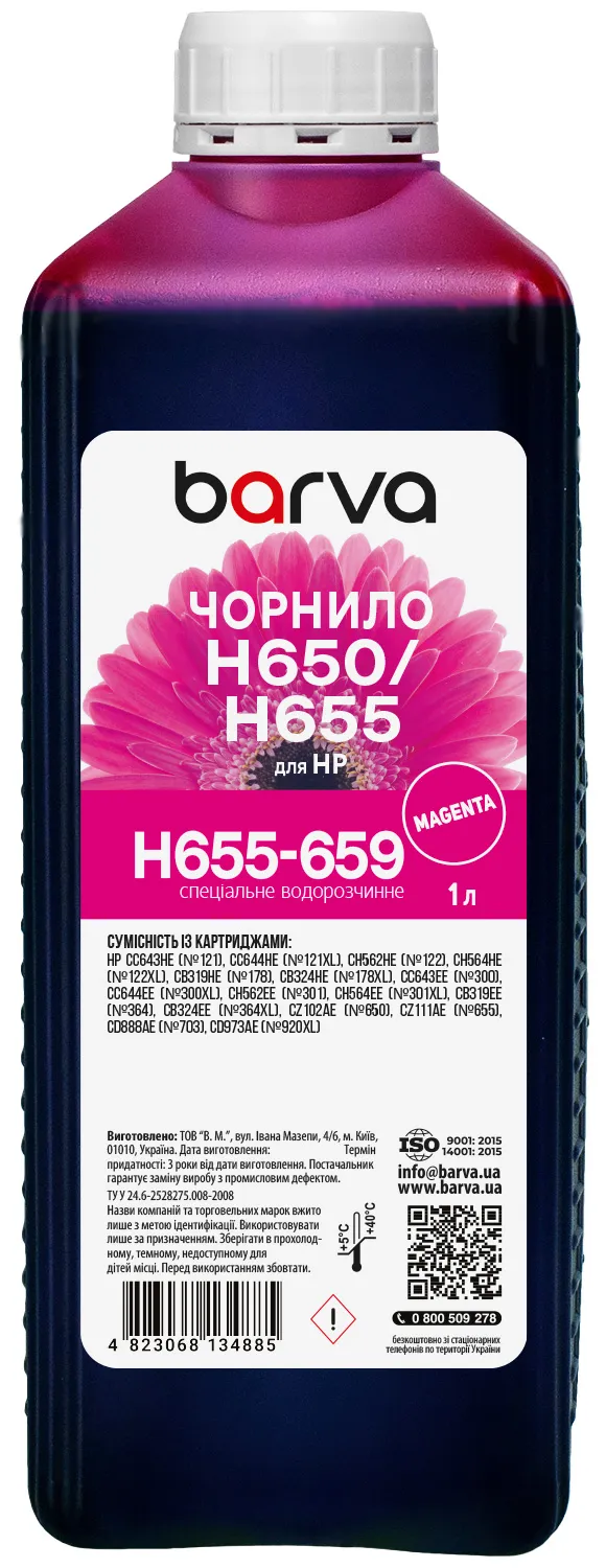 Чернила для HP 122/178/650/655 специальные 1 л, водорастворимые, пурпурные Barva (H655-659) - заказывайте на сайте patronservice.ua