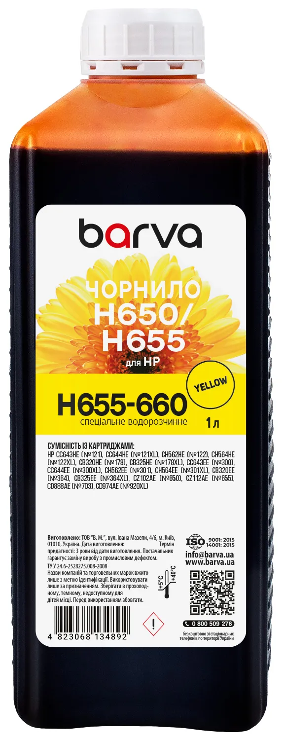 Чернила для HP 122/178/650/655 специальные 1 л, водорастворимые, желтые Barva (H655-660) - лучший выбор на сайте patronservice.ua