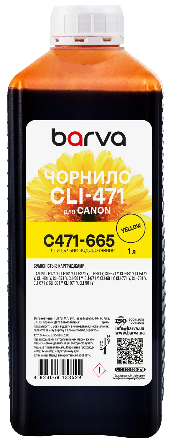 Вы можете купить Чернила для Canon CLI-471/CLI-481 Y специальные 1 л, водорастворимые, желтые Barva (C471-665) в нашем интернет-магазине с доставкой по Киеву и всей Украине.