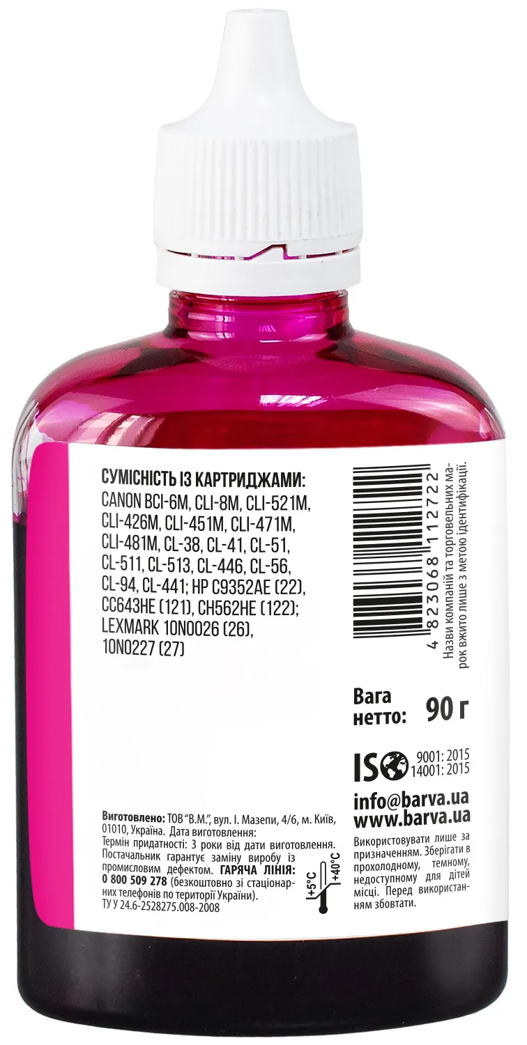 Украинская компания ООО «В.М.» занимается производством чернил под торговой маркой Barva уже много лет. На базе собственной лаборатории осуществляется как разработка новых формул, так и непрерывный контроль качества выпускаемой продукции. При производстве чернил производитель следует стандартам ISO 9001:2015 и ISO 14001:2015.