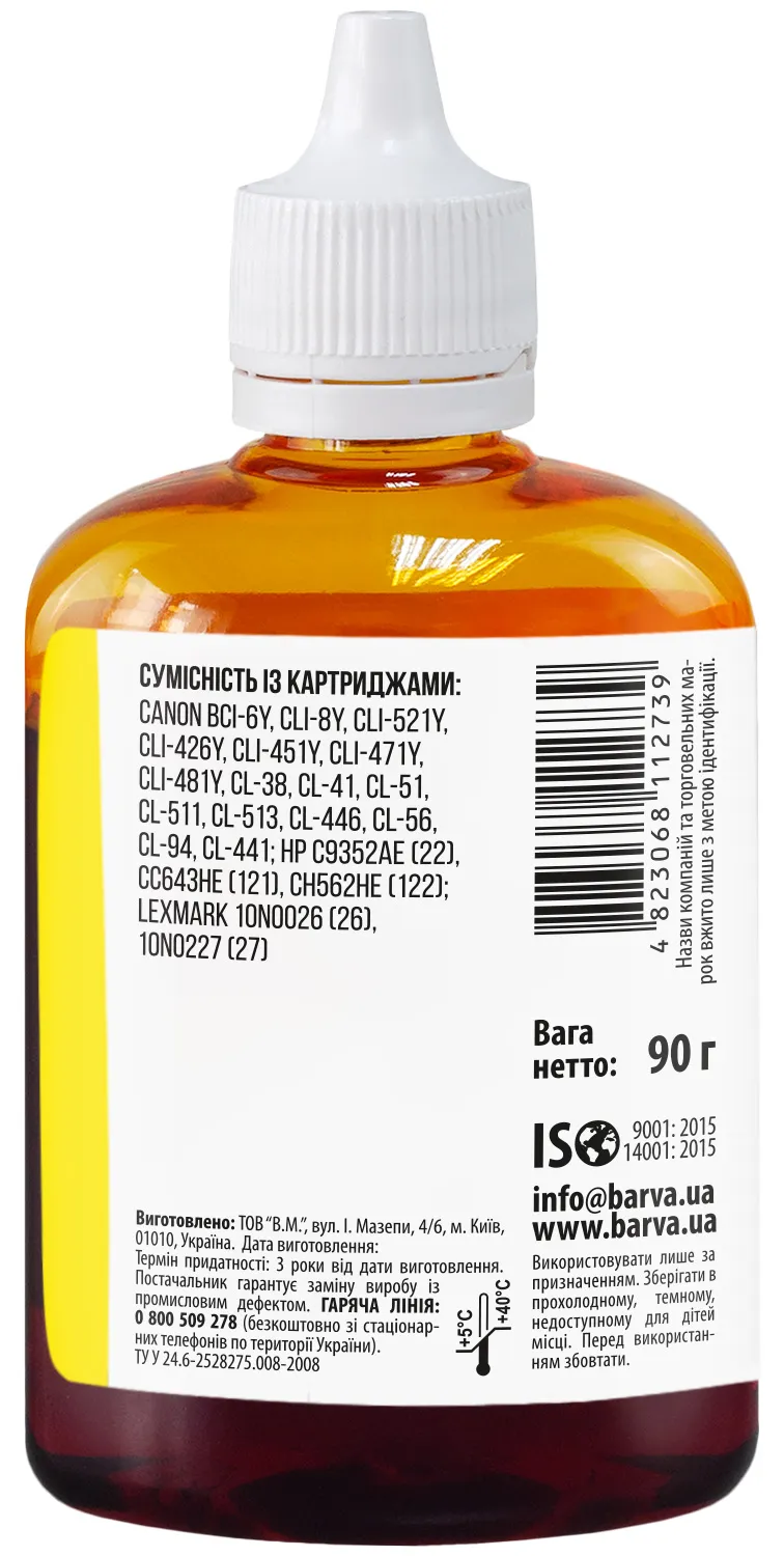 Украинская компания ООО «В.М.» занимается производством чернил под торговой маркой Barva уже много лет. На базе собственной лаборатории осуществляется как разработка новых формул, так и непрерывный контроль качества выпускаемой продукции. При производстве чернил производитель следует стандартам ISO 9001:2015 и ISO 14001:2015.