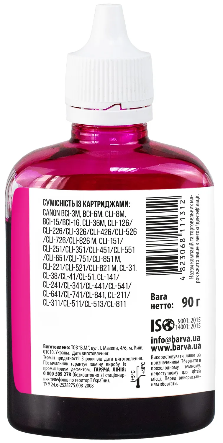 Украинская компания ООО «В.М.» занимается производством чернил под торговой маркой Barva уже много лет. На базе собственной лаборатории осуществляется как разработка новых формул, так и непрерывный контроль качества выпускаемой продукции. При производстве чернил производитель следует стандартам ISO 9001:2015 и ISO 14001:2015.