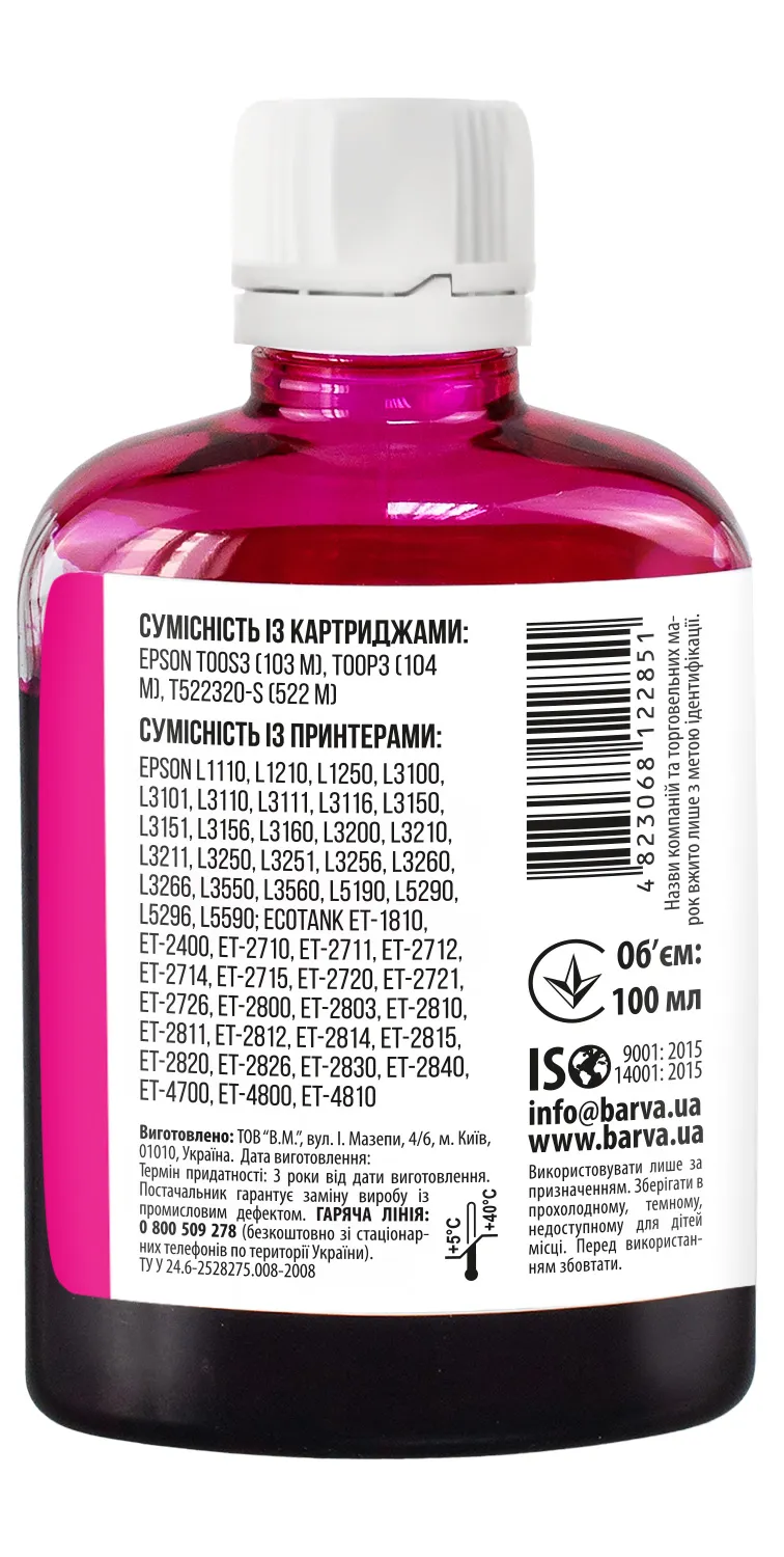 Украинская компания ООО «В.М.» занимается производством чернил под торговой маркой Barva уже много лет. На базе собственной лаборатории осуществляется как разработка новых формул, так и непрерывный контроль качества выпускаемой продукции. При производстве чернил производитель следует стандартам ISO 9001:2015 и ISO 14001:2015.