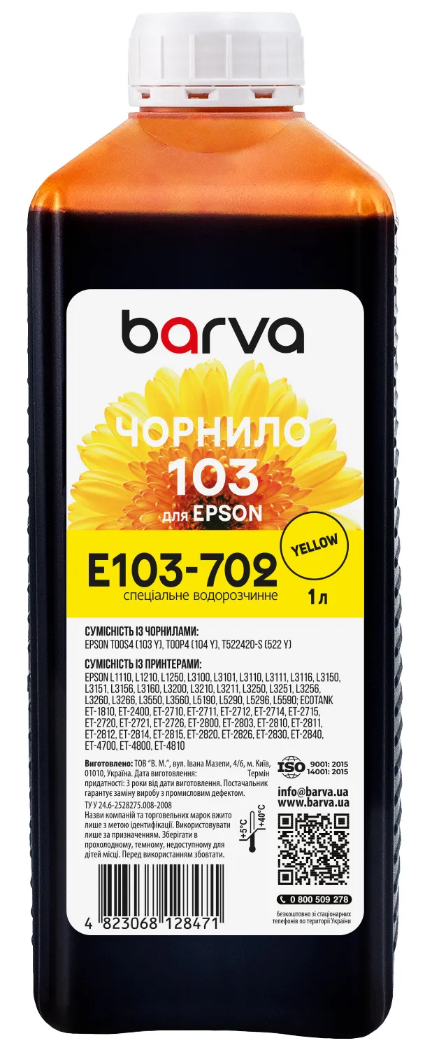 Чернила для Epson 103 Y специальные 1 л, водорастворимые, желтые Barva (E103-702) - заказывайте на сайте patronservice.ua