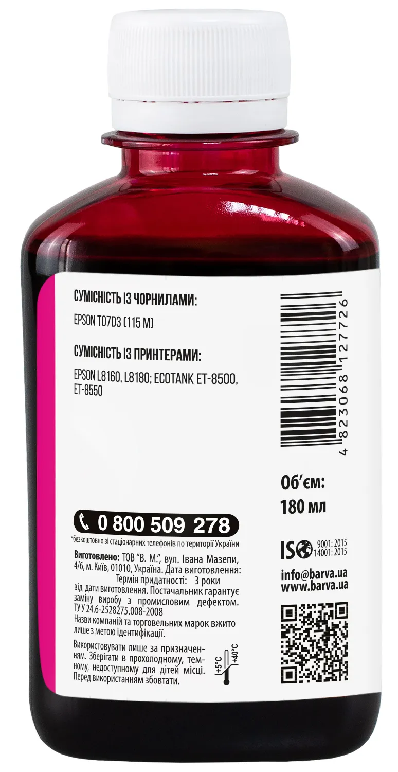 Украинская компания ООО «В.М.» занимается производством чернил под торговой маркой Barva уже много лет. На базе собственной лаборатории осуществляется как разработка новых формул, так и непрерывный контроль качества выпускаемой продукции. При производстве чернил производитель следует стандартам ISO 9001:2015 и ISO 14001:2015.