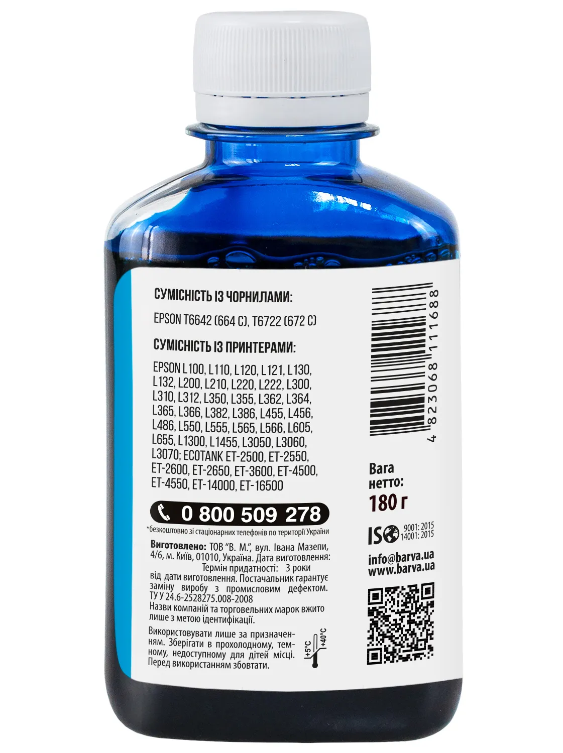 • Фасовка чернил Barva 180 гр./180 мл будет удобна пользователям, которым необходимо много печатать - в данном случае стоимость чернил будет ниже, чем в более маленьких фасовках (90 гр. или 100 мл).