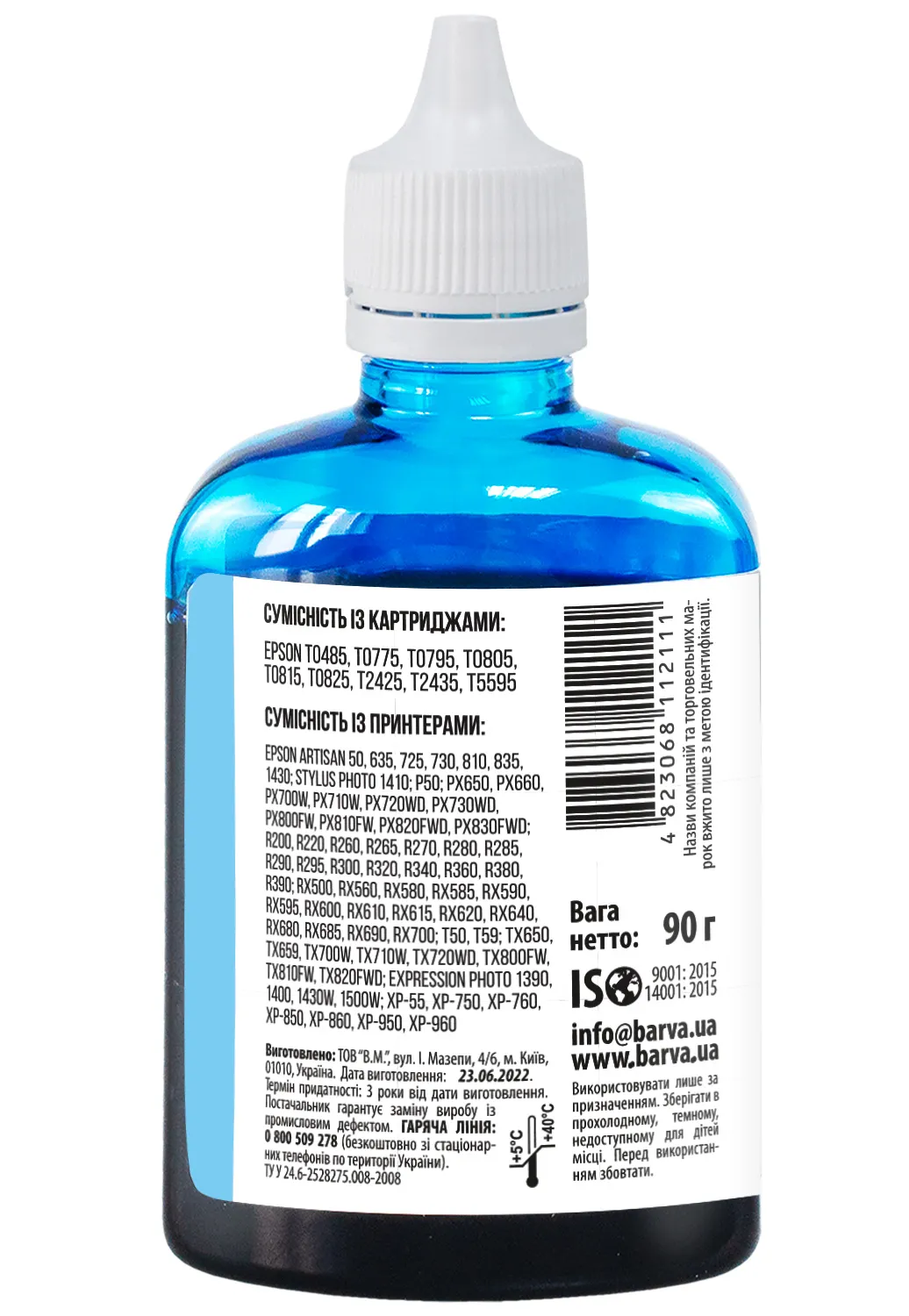 Украинская компания ООО «В.М.» занимается производством чернил под торговой маркой Barva уже много лет. На базе собственной лаборатории осуществляется как разработка новых формул, так и непрерывный контроль качества выпускаемой продукции. При производстве чернил производитель следует стандартам ISO 9001:2015 и ISO 14001:2015.