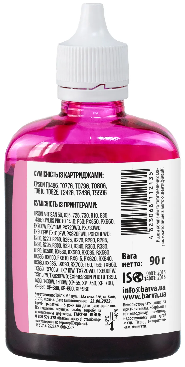 Украинская компания ООО «В.М.» занимается производством чернил под торговой маркой Barva уже много лет. На базе собственной лаборатории осуществляется как разработка новых формул, так и непрерывный контроль качества выпускаемой продукции. При производстве чернил производитель следует стандартам ISO 9001:2015 и ISO 14001:2015.