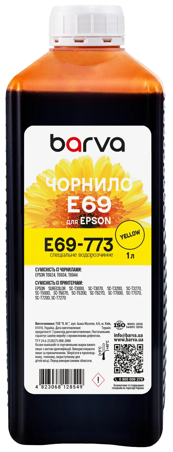 Многие из нас слышали, что в отличие от лазерной техники, которая формирует изображение с помощью тонера, струйная техника использует для печати специальные чернила (краски для принтеров). Чернила для Epson T6934 специальные 1 л, водорастворимые, желтые Barva (E69-773) используются для заправки струйных картриджей, ПЗК или СНПЧ.Чернила E69-773 Barva имеют официальную гарантию от производителя – ООО "В.М.".